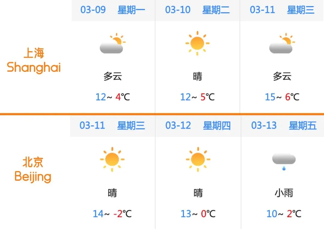 - 上海3月天气渐暖,建议携带轻薄外套;北京仍有些凉意,注意保暖。
