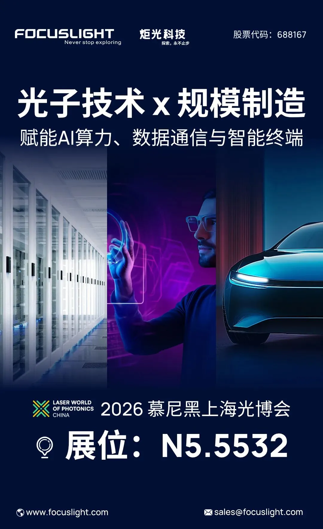 炬光科技为国家级高新技术企业,上海证券交易所科创板上市公司(股票代码:688167),成立于2007年9月,主要从事光子产业链上游的激光光源和原材料,微纳光学,光子产业链中游的光子应用模块、模组、子系统的研发、生产和销售,重点布局光通信、消费电子、泛半导体制程、汽车应用、医疗健康。炬光科技已发展成为全球高功率半导体激光器及应用领域有影响力的公司和品牌,目前在中国西安、东莞、韶关、合肥,德国多特蒙德,瑞士纳沙泰尔,新加坡,马来西亚拥有生产基地和核心技术团队。公司于2017年成功收购LIMO GmbH,2024年成功收购SUSS MicroOptics SA(现Focuslight Switzerland SA),同年成功收购ams OSRAM光学元器件资产,重启Heptagon品牌并拓展全球光子行业工艺和制造业务。更多信息请关注www.focuslight.com、www.hptg.com。