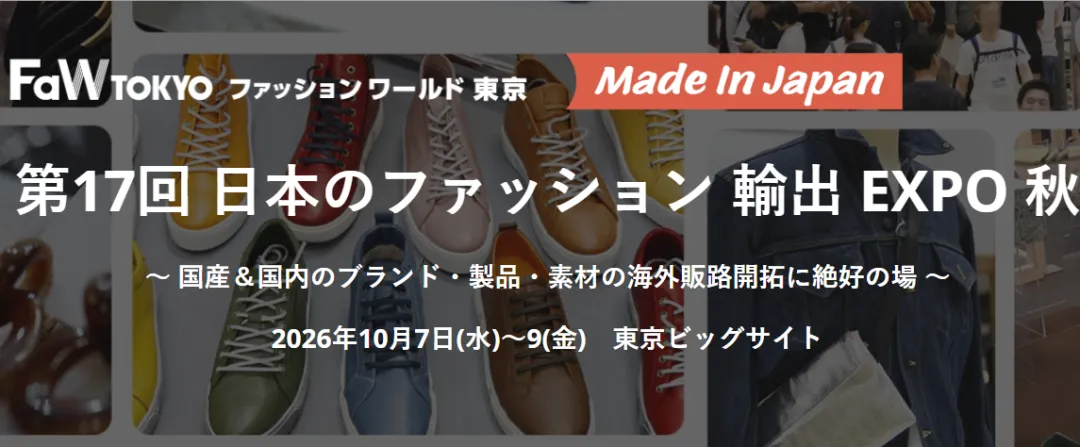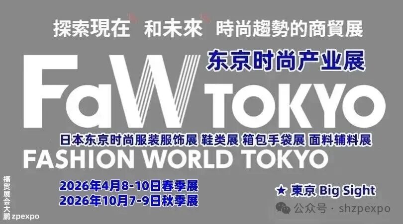 日本规模最大的时尚展——日本东京时尚流行成衣服装服饰,箱包,鞋类,饰品配件,布料辅料海外面料,时尚科技相关产品展览会FASHION WORLD TOKYO ( FaW TOKYO ),秋季展将于2026年10月7-9日在东京国际展览中心(Tokyo Big Sight)隆重举办!共计世界36国 1100社出展!日本最大のファッション展!东京时尚产业展!
