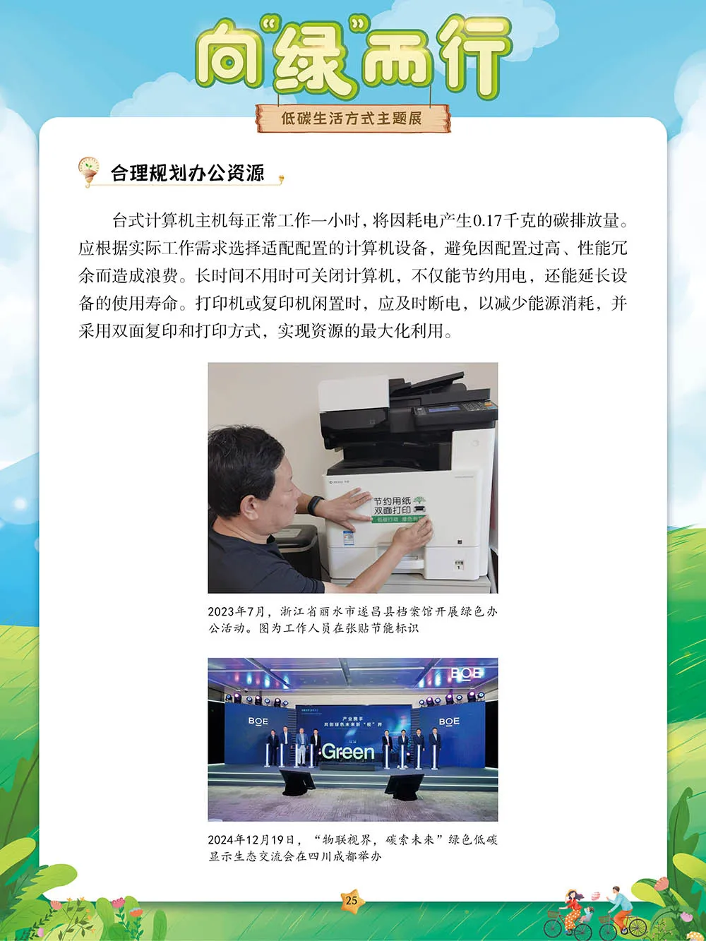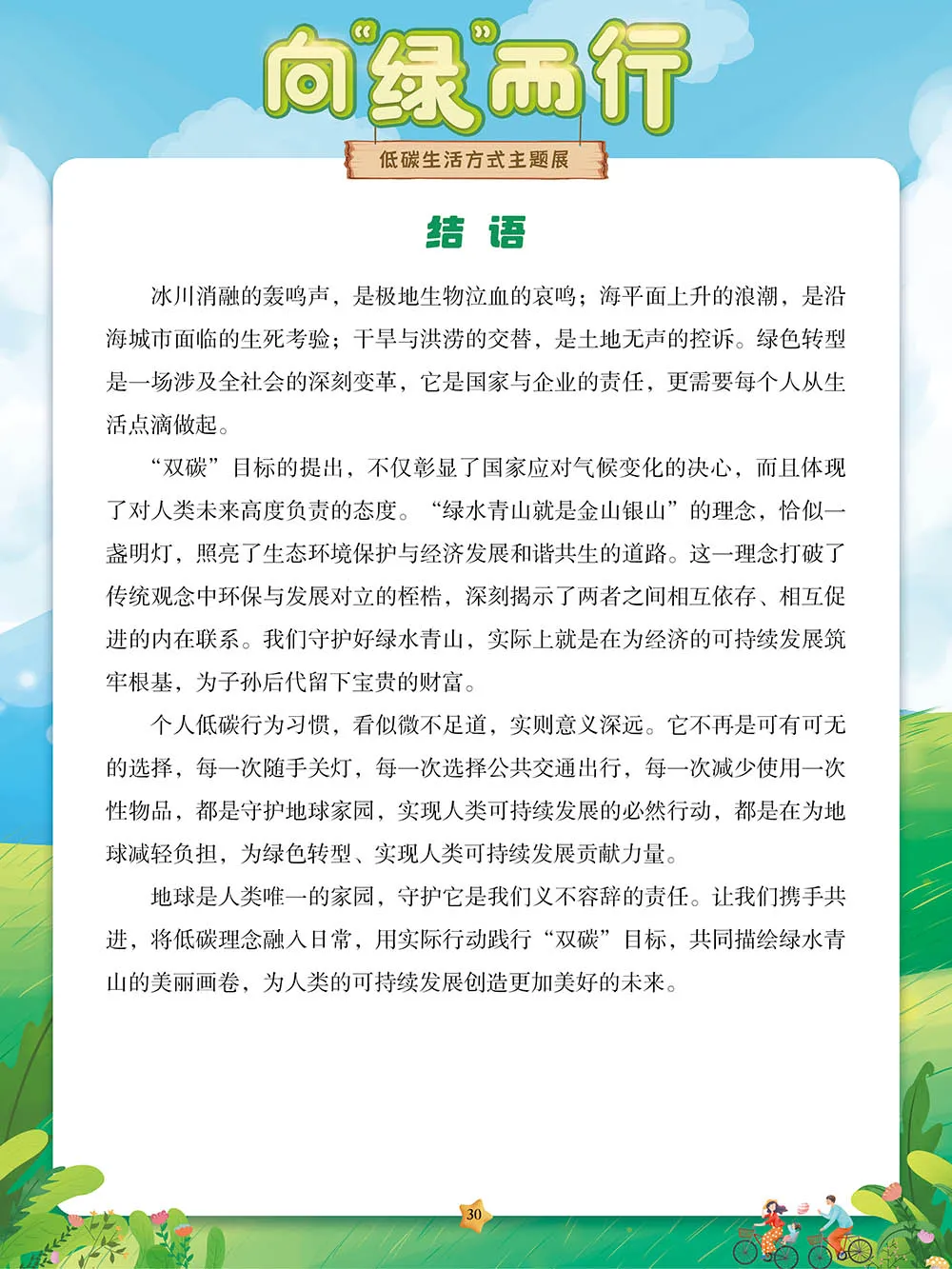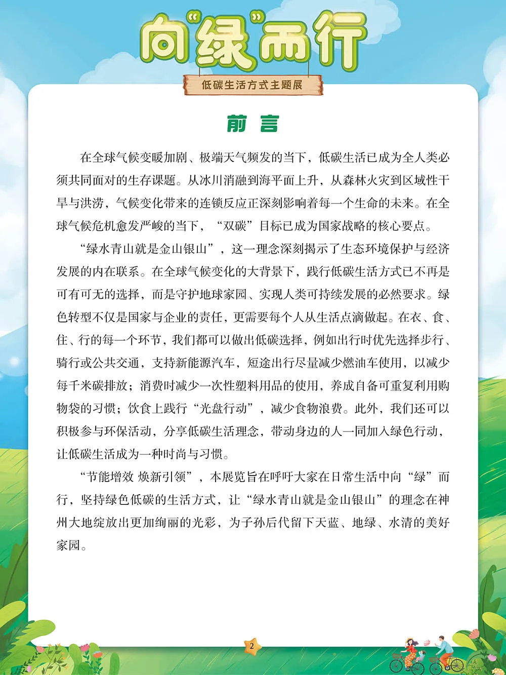 绿色转型不仅是国家与企业的责任,更需要每个人从生活点滴做起。本展览旨在呼吁大家在日常生活中向“绿”而行,坚持绿色低碳的生活方式,让“绿水青山就是金山银山”的理念在神州大地绽放出更加绚丽的光彩,为子孙后代留下天蓝、地绿、水清的美好家园。