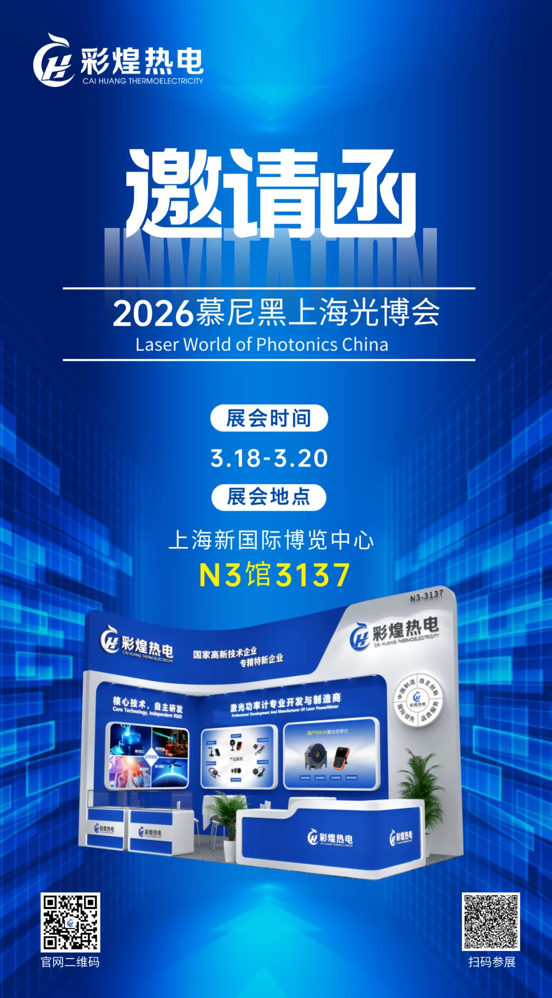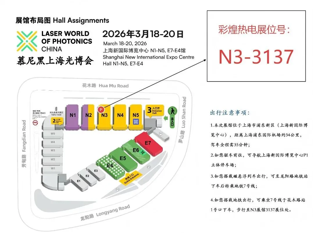 2026慕尼黑上海光博会(Laser world of photonic China)将于3月18日-20日在上海新国际博览中心盛大开幕,彩煌热电诚邀您莅临N3137展台,共赴这场激光行业的年度之约。