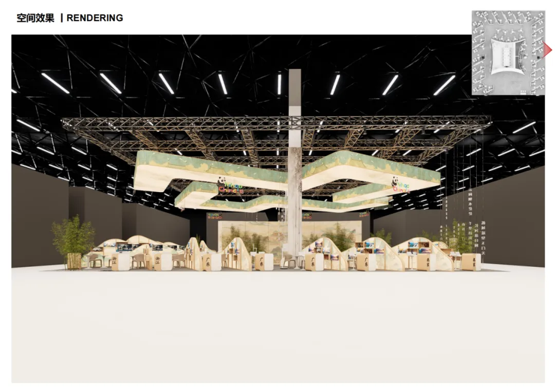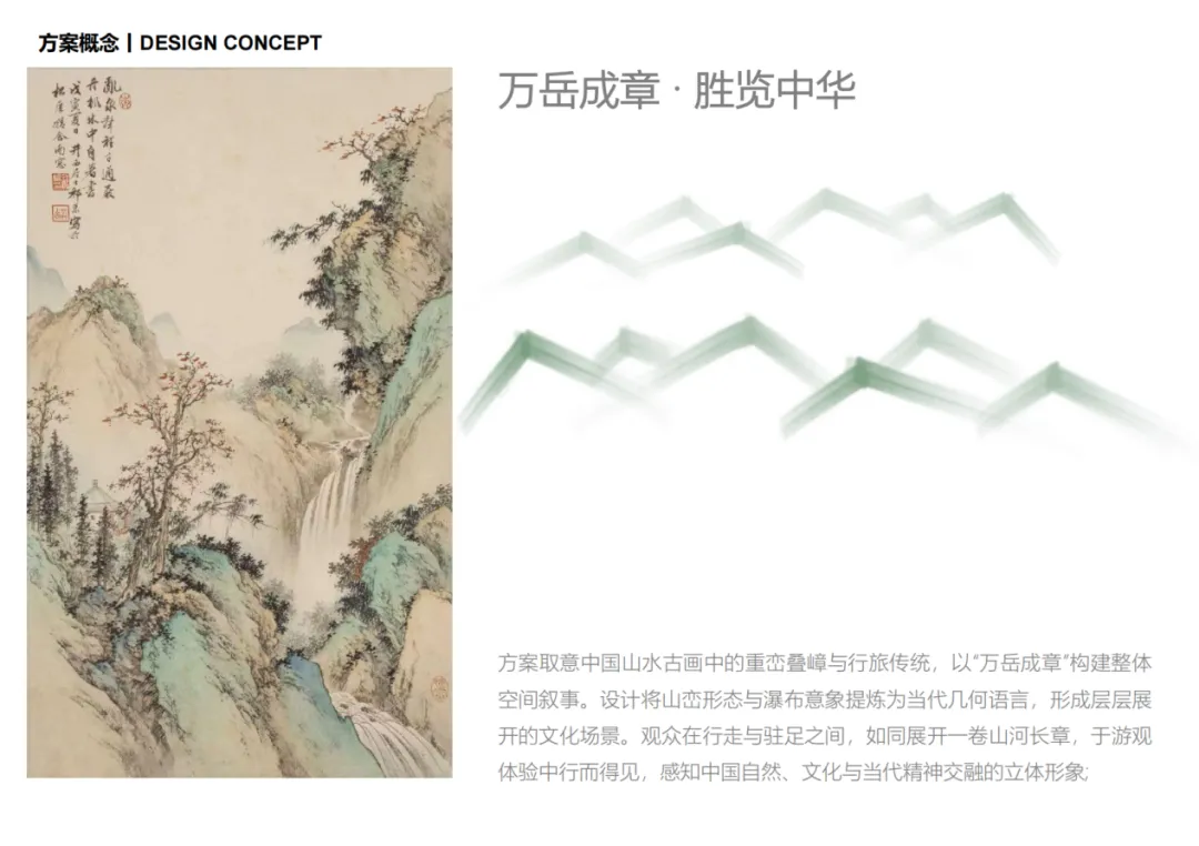 “万岳成章”方案以“行旅”为线索,通过“层叠-展开-融合”的叙事结构,在有限空间内构建出气象万千的中华胜览图卷。抽象提炼的当代“山峦”骨架,以层叠错落的手法形成连绵起伏的展示界面与探索路径,国内众多参展省市单元如画中胜景般被有机融入其间,既保持了各自的特色呈现,又共同谱写出和谐统一的文化篇章。参观者穿行其中,步移景异,在“游观”之间领略中国自然与人文的多元魅力。