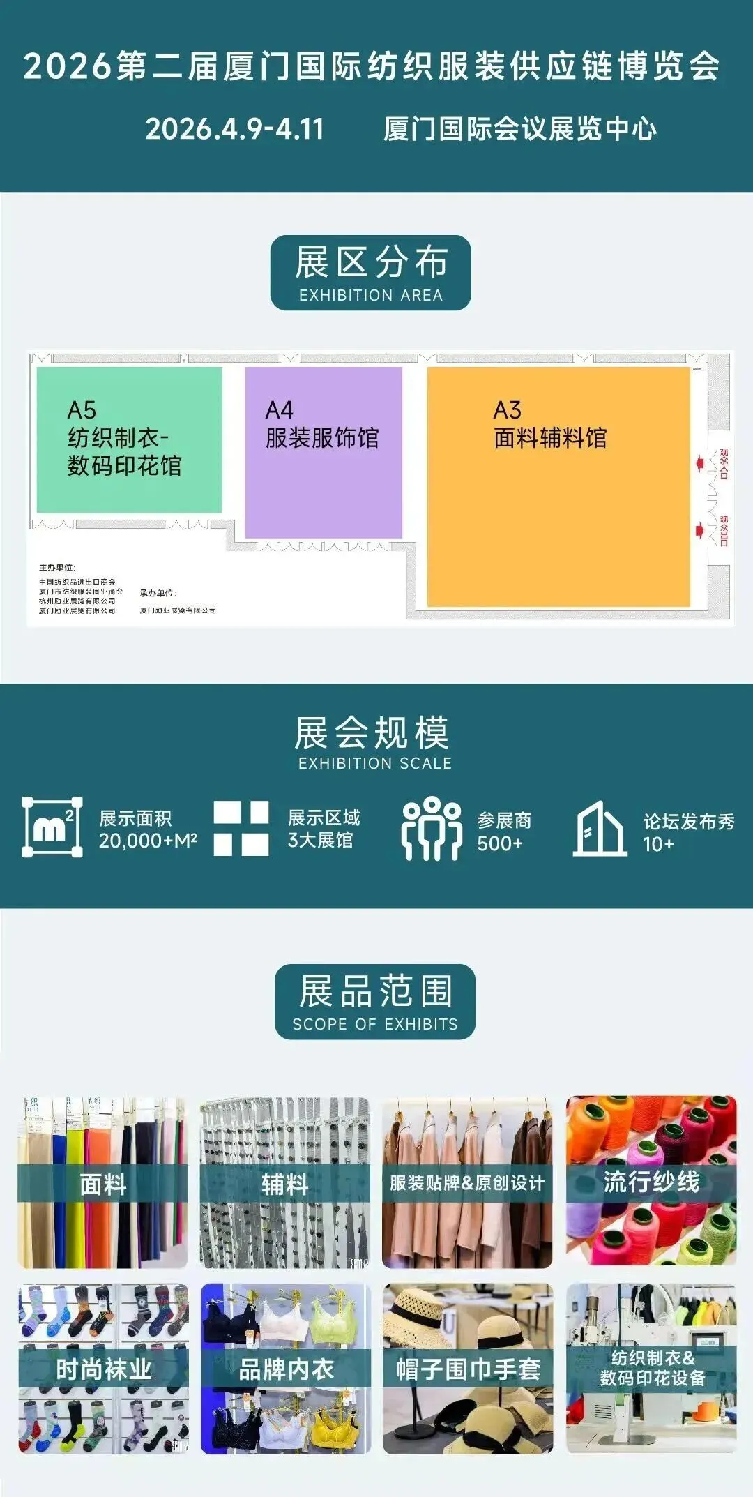 秉持着“共商、共融、共谋行业发展”的理念, 2026第二届厦门国际纺织服装供应链博览会精心规划3大展馆,展示面积超20000平方米,展品范围包含面料、辅料、原创设计、服装贴牌、流行纱线、时尚袜业、品牌内衣、帽子围巾手套、纺织制衣、数码印花设备等。