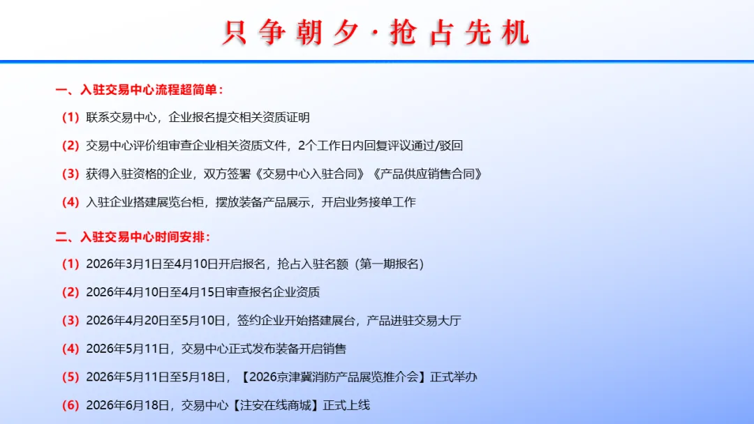 【注安消防产品交易中心】座落在天津市津南区咸水沽镇南环路112号,是致力于“火灾、地震、气象、交通、水域、卫生、低空 、通信、环境、安防、危化”等公共安全领域,打造汇集:应急物资仓储、应急装备展示、应急科普培训、应急救援队伍驻训、应急日常演习训练、应急物资快速调运、应急装备集散联运、应急产品销售贸易、应急物资供应链服务的多场景综合服务平台。 【注安消防产品交易中心】以“为平时提供预防,为战时提供保障”的核心理念,积极推动“公众服务、专业服务、决策服务、专项服务”的发展目标,积极推进应急物资“实物储备+产能储备+协议储备+”的建设,为“防灾,减灾、抗灾”在管理、调拨、配送的全过程动态管控,提供 “随时可用、按需可调,持续供应”的应急保障解决方案。
