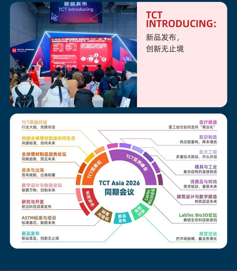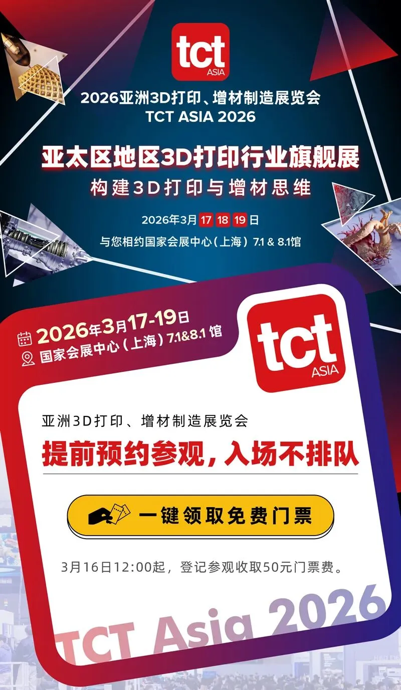 2026年TCT亚洲展将于2026年3月17-19日在国家会展中心(上海)7.1&8.1馆举办,规模预计达55,000平方米,吸纳550+参展商和40,000+名专业观众共襄盛举,3D打印新品将超1000件。同期将举办超100场主题论坛。