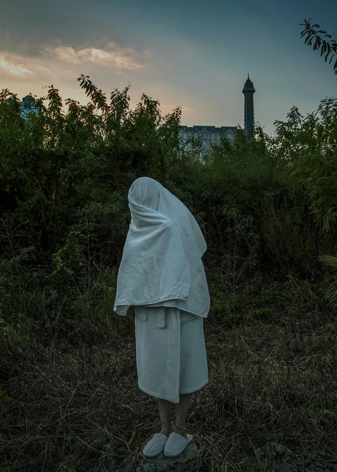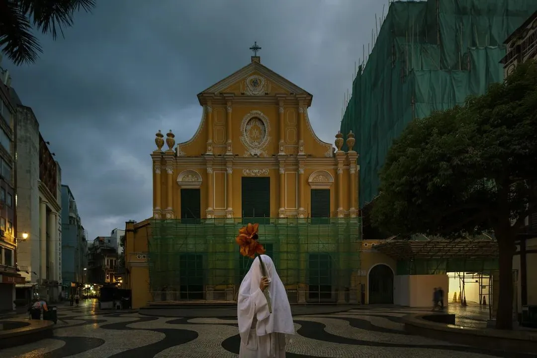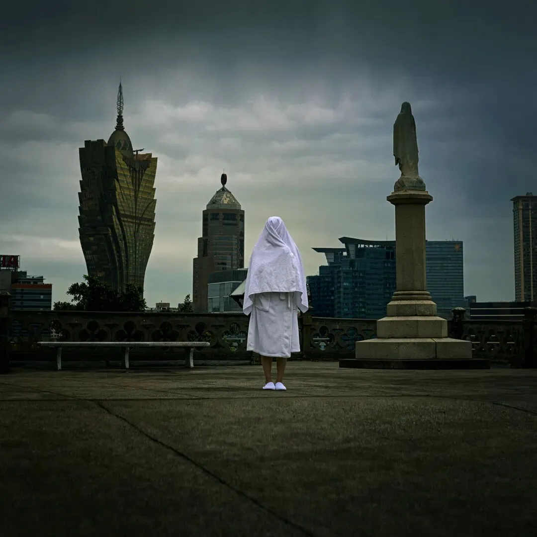 2017年天鸽风灾,成为她创作的重要转折。她从记录城市美景,转向追问个体在时代变迁中如何定位自我、寻找精神归宿。作品中,身着酒店浴袍的白色身影置身澳门街巷、海岸、赌场与废墟,成为标志性符号:既是职业印记,也是公共与私密的边界解构,更是匿名个体的象征,在城市中成为既在场又疏离的观察者。