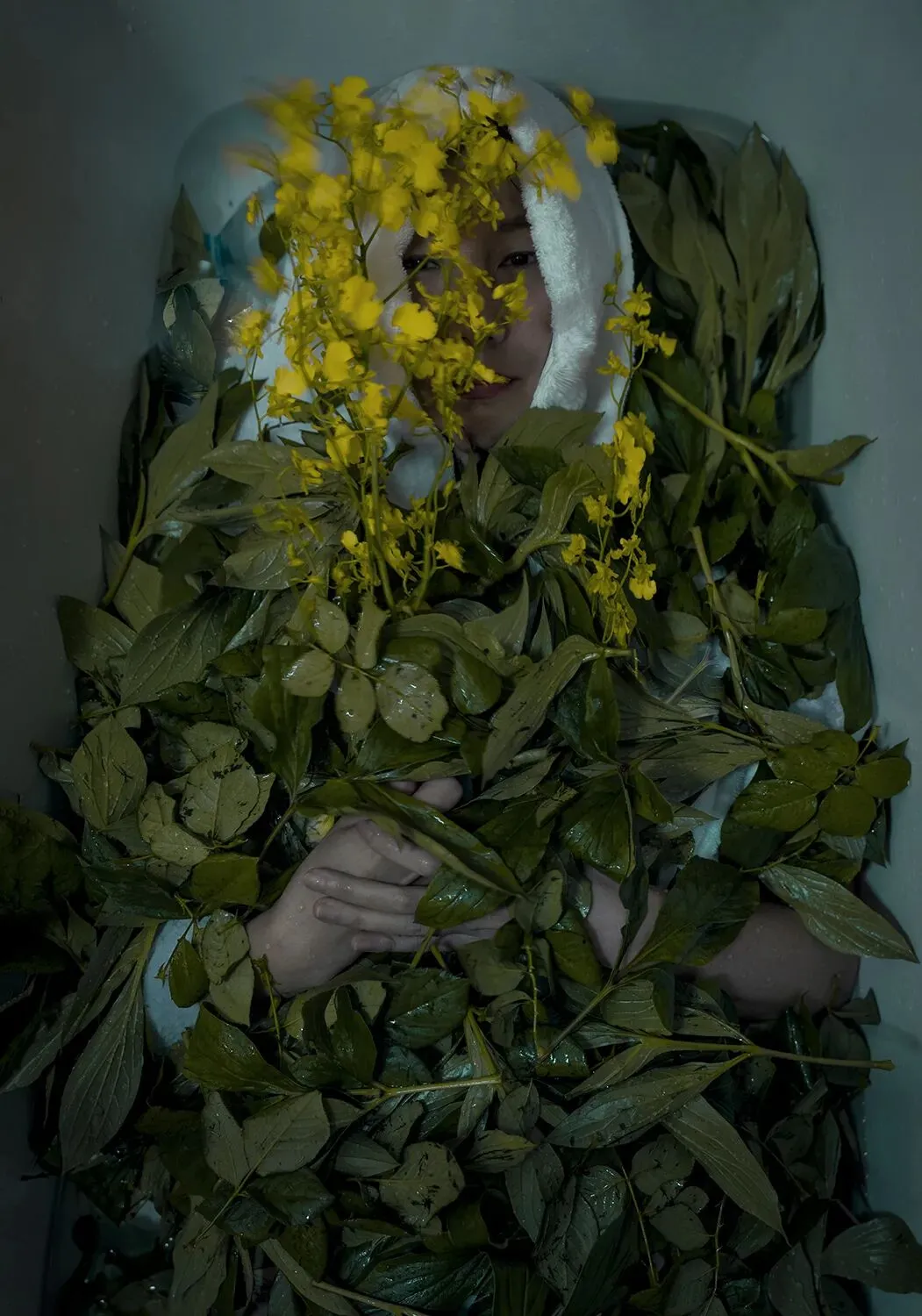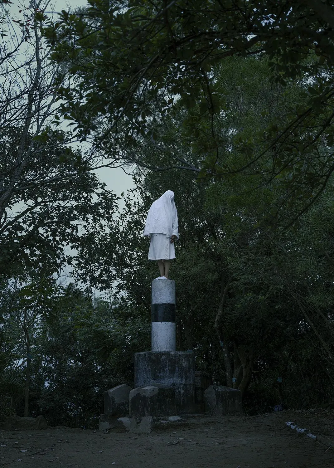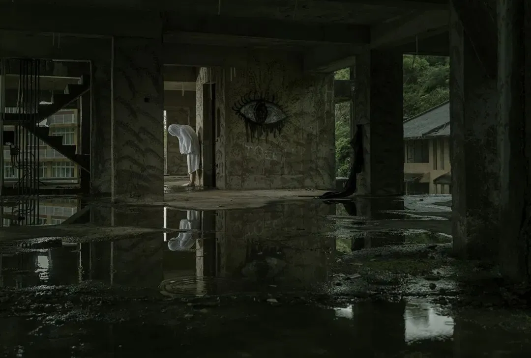 2017年天鸽风灾,成为她创作的重要转折。她从记录城市美景,转向追问个体在时代变迁中如何定位自我、寻找精神归宿。作品中,身着酒店浴袍的白色身影置身澳门街巷、海岸、赌场与废墟,成为标志性符号:既是职业印记,也是公共与私密的边界解构,更是匿名个体的象征,在城市中成为既在场又疏离的观察者。