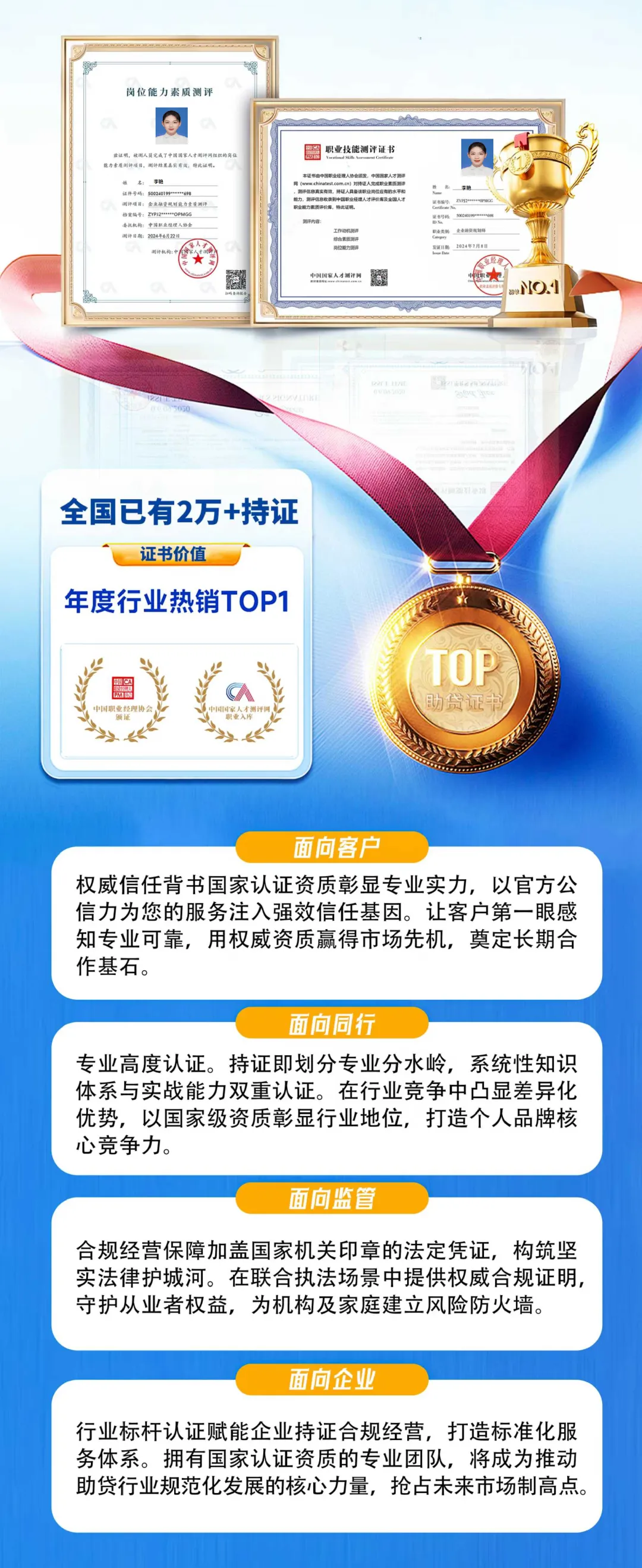 该职业技能测评证书是由中国职业经理人协会颁发,中国国家人才测评网实施测评并给出测评报告,职业信息收录到中国职业经理人才评价库及全国人才职业能力素质评价库。
