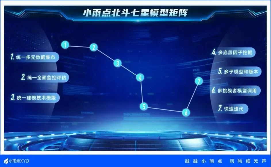 小雨点小贷采用了贯穿贷前、贷中、贷后全流程的智能风控解决方案,其中最关键的便是“北斗七星”智能风控模型。与单一大模型不同,这是一个由多个小模型组成的灵活模型矩阵,可根据不同行业、不同场景的需求,实现快速迭代、组合与优化配置,精准适配小微企业多样化的经营特点。为了精准刻画企业真实经营状况,该模型拓展了多维数据源,不仅整合了工商、司法、征信等基础数据,更深度纳入发票、税务等核心经营数据,同时与支付、物流、移动通信等机构深度合作,构建起全方位、立体化的企业评估体系。