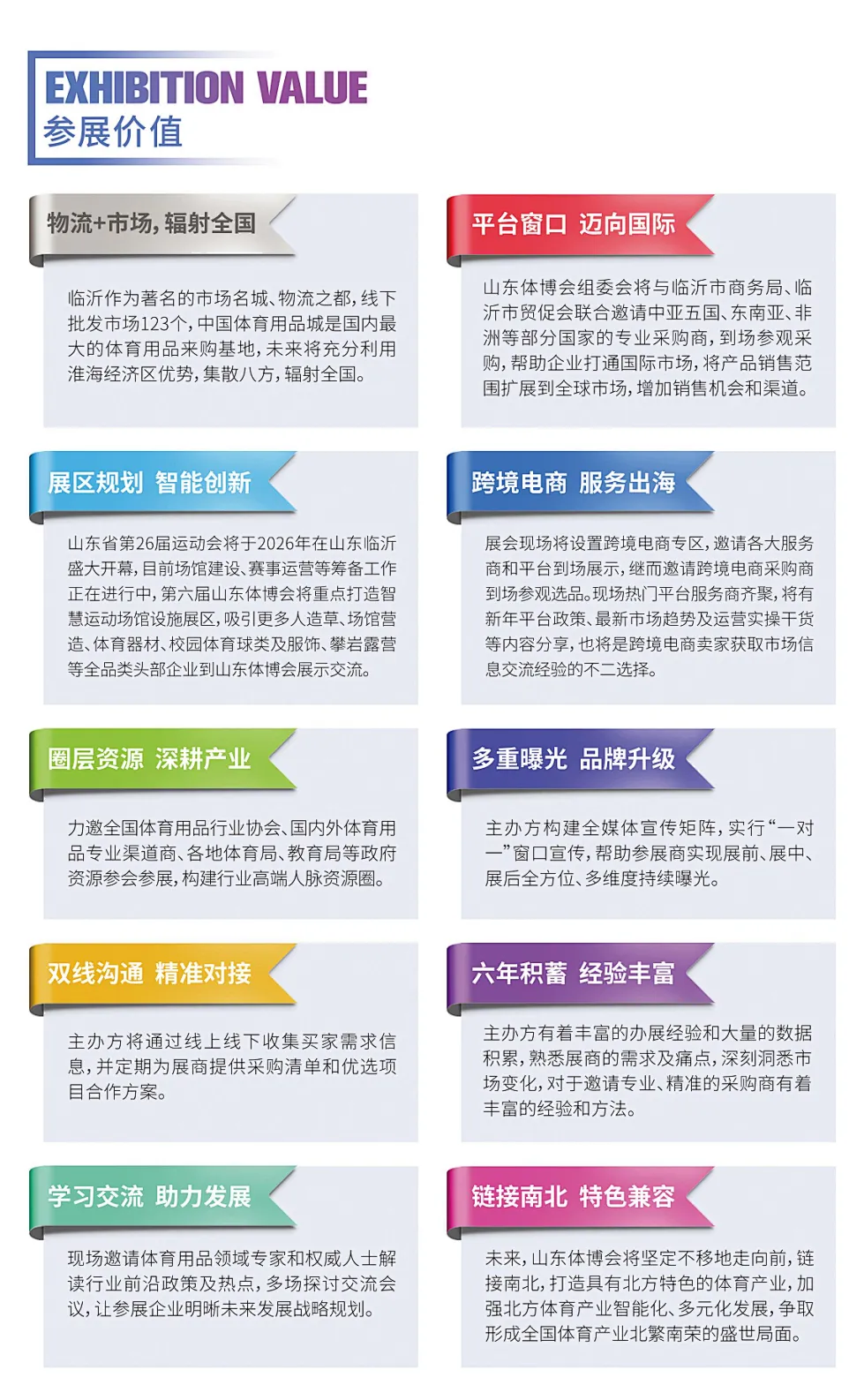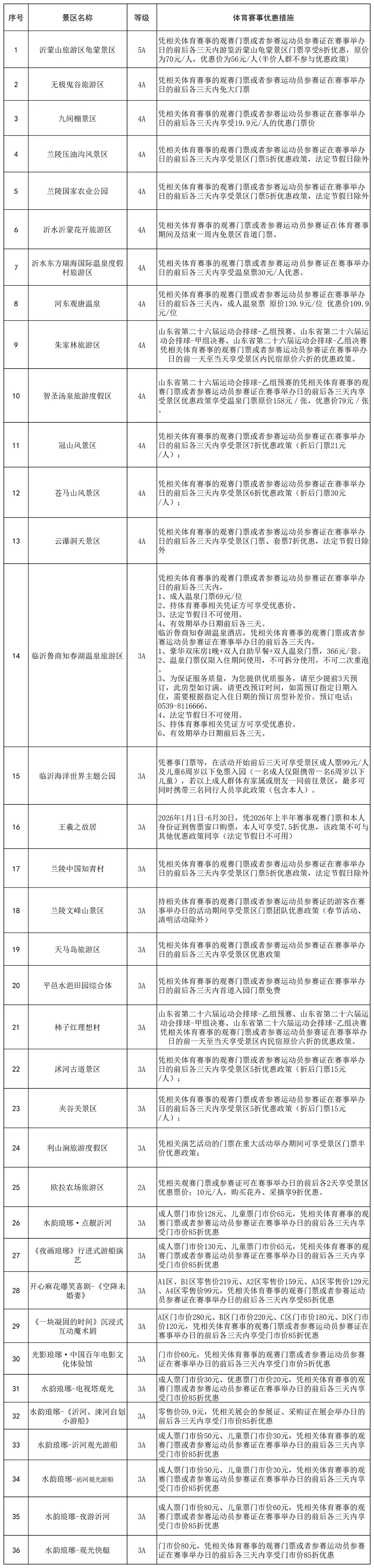 为促进“展文旅”深度融合,凭本届山东体博会嘉宾证、展商证、采购商证等有效证件,即可在展会举办日(8月27日-29日)前后各三天内,享受临沂多家优质景区、特色文旅项目专属优惠,部分景区更有免票、专属折扣等重磅福利,我们希望您在收获商机的同时,也能慢下来,看一看沂蒙的山水,吹一吹沂河的晚风,感受这座城市的热情与温度。