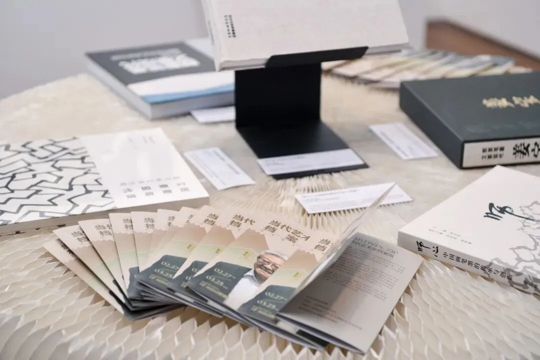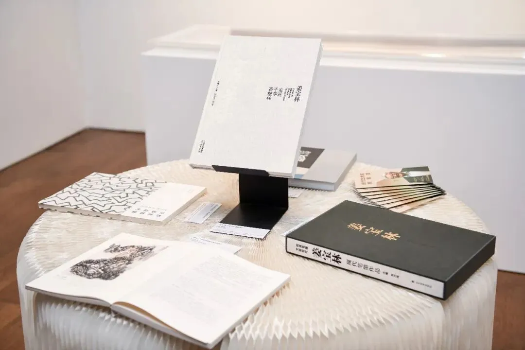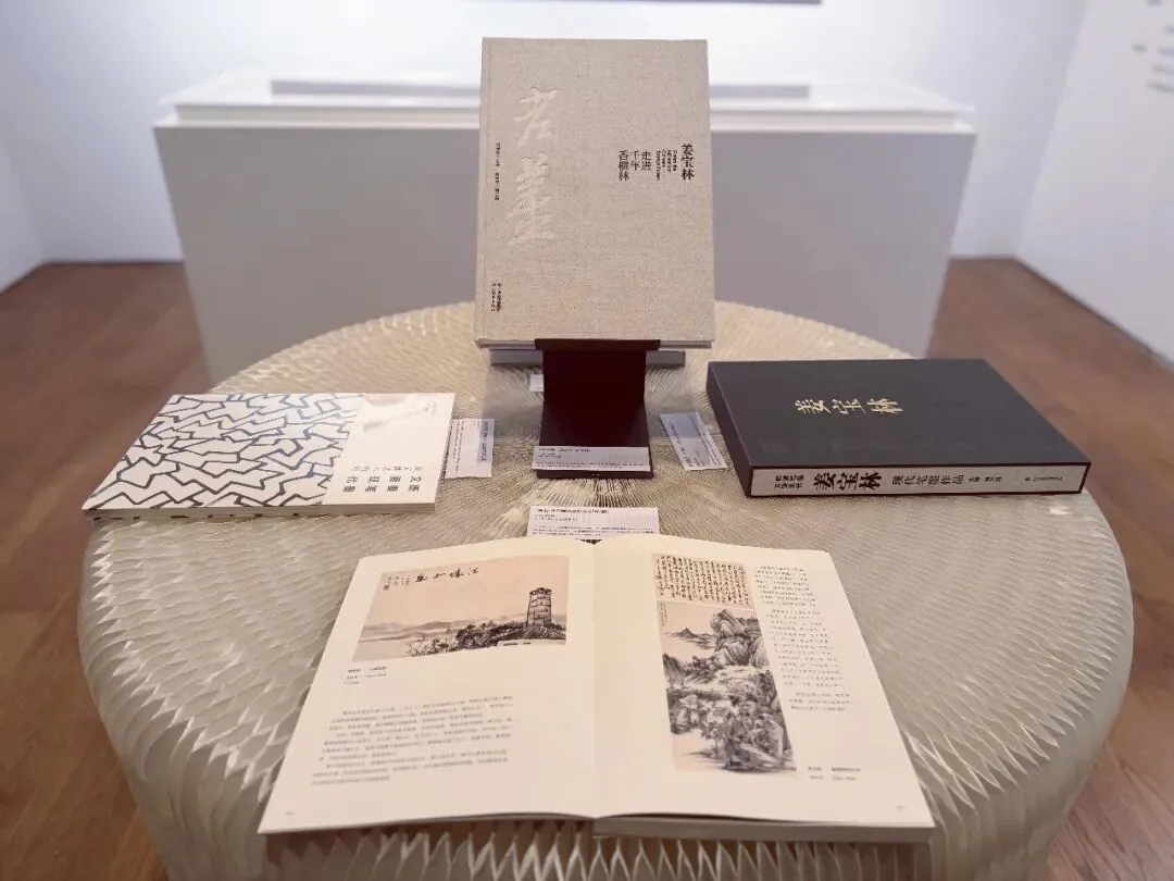 展区陈列着姜宝林艺术生涯中极具价值的各类文献资料,从创作成果到思想凝练,完整呈现其艺术探索的全脉络。其中既有《中国美术家作品集:姜宝林》《姜宝林:走进千年香榧林》等画集,系统收录了他不同时期的代表作品,清晰展现其从师法南北名家到形成个人风格的创作演变;也有《师心:中国画笔墨的传承与创新》这部专业论著,凝练了他数十年对笔墨墨创作的思考,精准阐释 “既要笔墨,又要现代” 的核心理念。此外,展区还展出了记录其艺术生涯的海内外展览档案、专业学术评论与研究文章,这些可触可感的文献,如同姜宝林笔墨探索之路的 “思想路标”,让观众得以循着文字与作品,读懂当代笔墨从传统走向现代的探索历程。