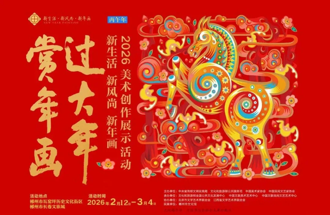 为深入学习贯彻党的二十届四中全会精神,传承弘扬中华优秀传统文化,丰富人民群众节日精神文化生活,由中央宣传部文明实践局、文化和旅游部公共服务司、中国美术家协会、中国民间文艺家协会共同主办,文化和旅游部全国公共文化发展中心、中国文联美术艺术中心、中国文联民间文艺艺术中心承办,北京市文学艺术界联合会、江西省文学艺术界联合会协办,郴州市文化馆实施2026年“新生活·新风尚·新年画”美术创作展示活动和线上活动,以年画艺术激活传统节日文化内涵,营造文明祥和的节庆氛围,作品主题鲜明、内涵丰富,描绘了新时代人民美好生活新图景,展现了新时代文明实践新成果。