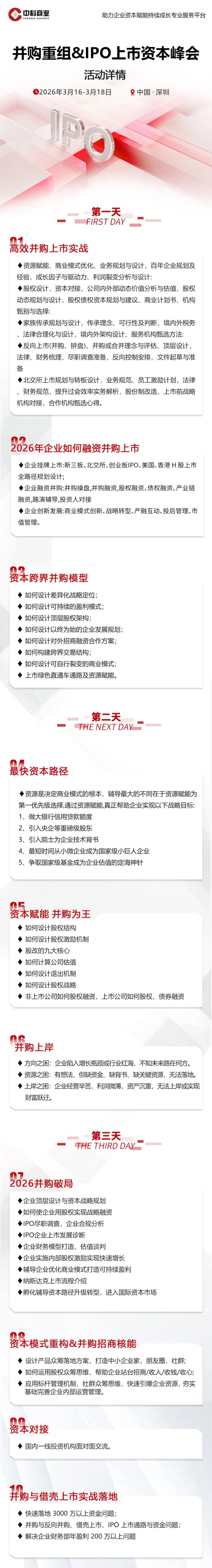 本次峰会更有强大资本阵容导师,亲临现场,分析当下资本市场的新格局,以案例形式,为企业家剖析上市企业的商业模式,融资诀窍,为中小微企业家撬开融资、并购与IPO上市认知,为中小企业资本运作铺就”康庄大道“。