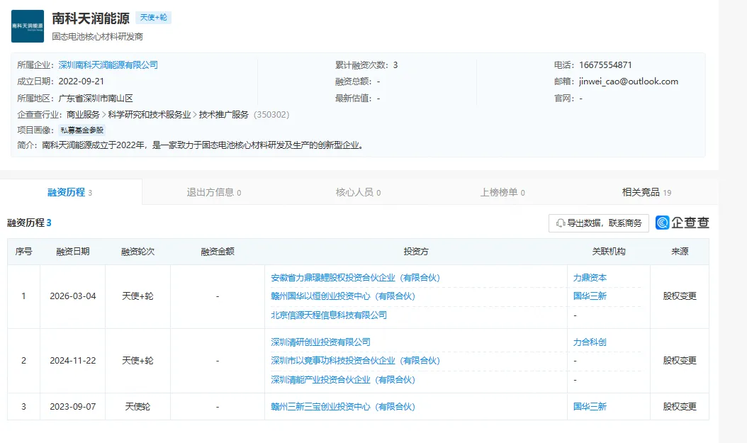 深圳南科天润能源有限公司成立于 2022 年 9 月,注册地位于深圳市南山区,是一家专注固态电池核心材料研发、中试与产业化的创新型硬科技企业。公司聚焦硫化物 / 氧化物固态电解质、固态正极、金属负极等关键材料研发,已布局多项核心专利,致力于为新能源汽车、高端储能与特种装备提供高安全、高能量密度的固态电池材料解决方案。该轮资金主要用于中试线建设、工艺迭代与市场拓展。目前已在四川、浙江等地设立全资子公司,推进研发与生产基地落地,快速构建全国化产业布局。作为国内固态电池上游材料领域的早期创新企业,南科天润以技术自主化与量产落地为核心,持续推动固态电池从实验室走向商业化应用。