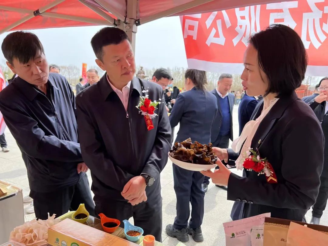 宝泉岭分公司党委委员、副总经理施宏伟到延军农场有限公司展位询问参展情况,品尝有机木耳。
