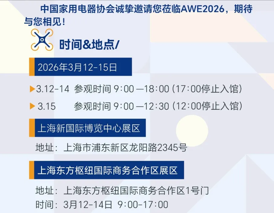 作为全球三大家电及消费电子领域最具影响力的三大展会之一,由中国家用电器协会主办的中国家电及消费电子博览会(AWE2026),将于2026年3月12日—15日在上海重磅启幕。本届展会首次启用“一展双区”创新模式,以“AI科技·慧享未来”为核心主题,总展览面积突破17万平方米,汇聚1200+全球顶尖企业。