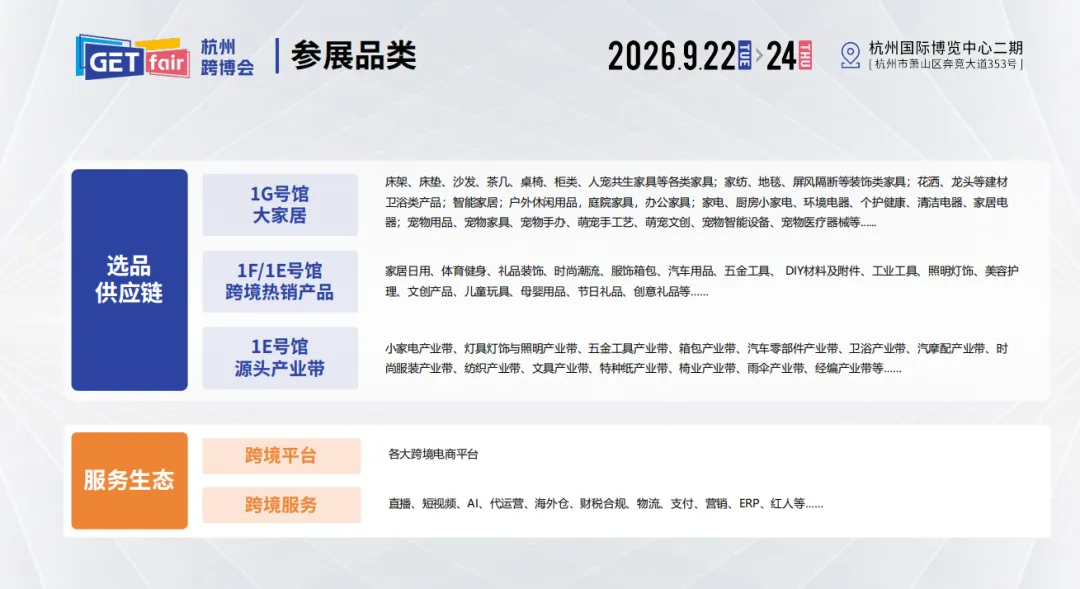 2026杭州跨博会扩容50%并升级运营“跨博会”成熟的大家居供应链资源,整合浙江各地市优质产业带,同步结合平台热销榜单定向邀约核心品类,形成“大家居+产业带+热销品”的高端展会定位,助推传统外贸与国内电商转型升级,将成为GETfair又一旗舰展会。