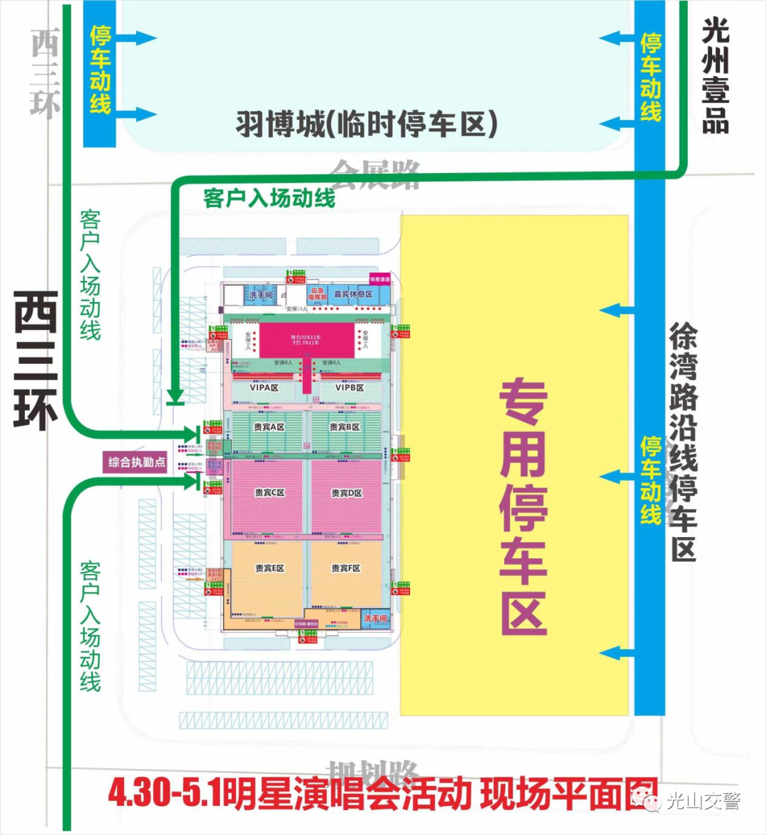 四、注意事项 (一)管制路段内,小型车辆应减速通过,车辆及行人需注意安全,严格按照交通标示指示和现场交警指挥有序通行。 (二)会展中心周边设有交通引导员,请参加活动的人员将车辆停放在会展中心东侧专用停车区或羽博城临时停车区内,管制路段内西三环道路两侧禁止停放车辆。 (三)管制路段恢复社会交通时间由公安机关交通管理部门根据实际情况决定。 (四)由于限制通行给大型车辆出行带来不便,敬请谅解。 特此通告 光山县公安交通警察大队 2023年4月29日