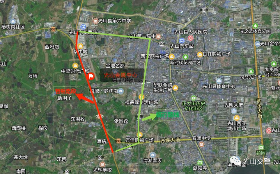 光山会展中心启用仪式活动将于近日在我县举行,为确保活动顺利进行,保障道路交通安全、畅通,依据有关法律规定,对西三环部分路段实行限制车辆通行管制措施,过往大型车辆需提前绕行。现将有关事项通告如下: 一、管制时间 2023年4月30日18:00至22∶00 2023年5月1日18:00至22∶00 二、管制路段 西环城路光马路口至光南路口段 三、绕行路线 (一)由北往南行驶大型车辆绕行路线:从西环路十里路口--弦山北路(右拐)--兴隆路--光辉大道路口(右拐)--西三环光辉大道(左拐);