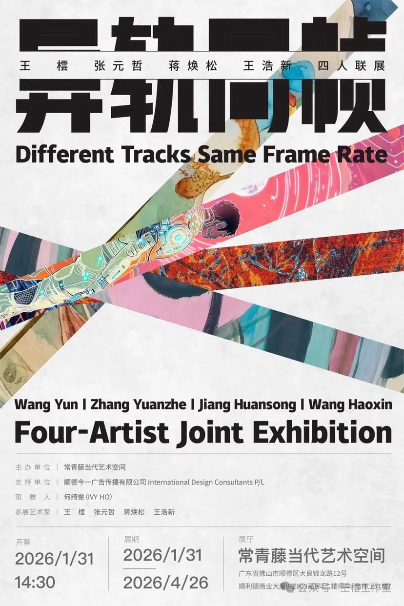 丨介绍丨“异轨”是四位艺术家各自独立的创作路径——王橒的哲学性视觉表达、张元哲的先锋数字绘画、蒋焕松的抽象色彩实验、王浩新的当代叙事性创作,每条轨迹都带着独特的艺术语言与思考。“同帧”则是他们在当代艺术语境下的同频共振,尽管媒介与风格各异,却都在以各自的“帧速”回应时代议题,最终在同一空间里构成一场流动的视觉对话。