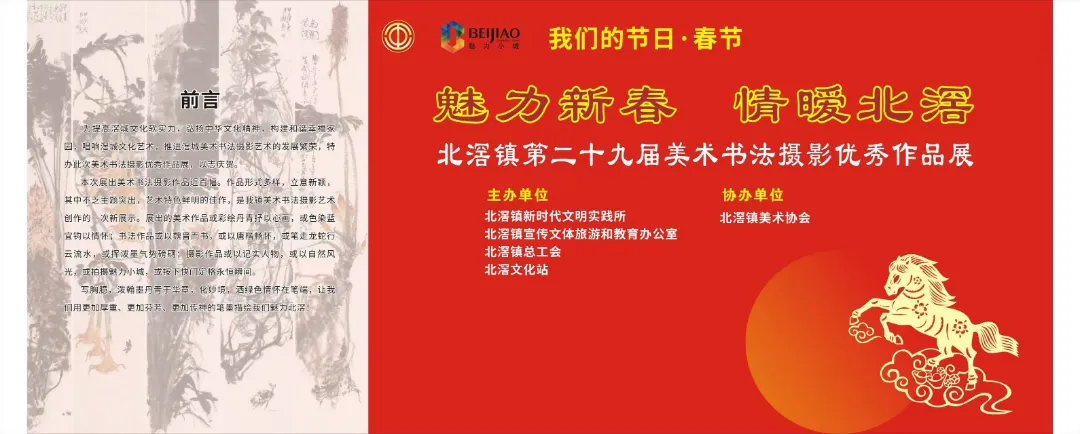 丨介绍丨书画贺年展,翰墨迎新春。在新一届北滘镇迎春美术书法摄影优秀作品展,为提高文化软实力,弘扬中华文化精神,构建滘城和谐幸福家园,营造热烈的节日氛围,唱响滘城文化艺术,推进滘城书画摄影艺术的发展繁荣,特办此次书画摄影作品展,以志庆贺。
