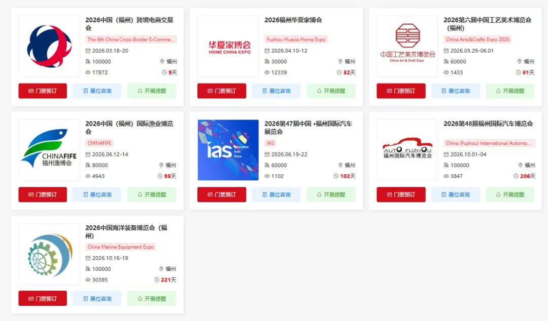 2026福州将举办多场重要的展会活动,涵盖了跨境电商、家具、工艺品、渔业、汽车、船舶展等多个领域。小编为大家整理了2026年福州展会排期表(最新版),希望能帮助你规划行程。末文获取福州展会门票预约入口~(大多门票限时免费)