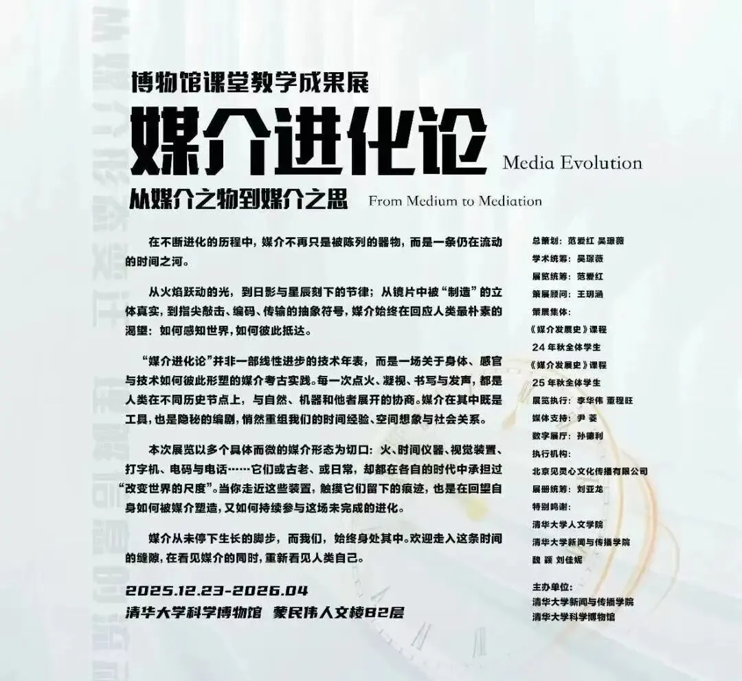 本次展览由清华大学“媒介发展史”课程2024、2025级同学们共同策划,以“媒介进化论”为主题,通过实物展示、互动体验、数字技术等多种形式,生动呈现媒介从古至今的演变历程,以及媒介如何深刻影响人类对世界的感知与认知。