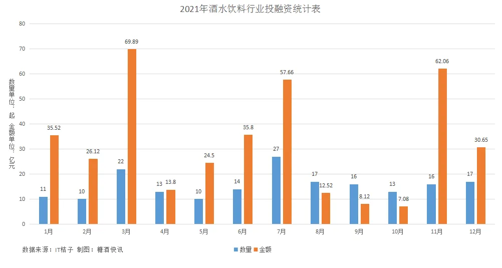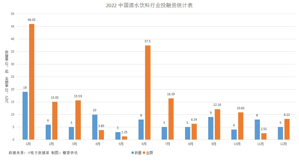 尽管2022年二级市场的资金从白酒行业大量流出,但是一级市场流入白酒行业的资金反而有所增长。IT桔子数据库显示,2021年酒水饮料行业共发生186起投融资事件,披露投融资金额373.82亿元,而2022年酒水饮料行业共发生87起投融资事件,共计投融资金额175.76亿元,可以看到2022年,从一级市场流入酒水饮料行业的资金受到巨大影响。