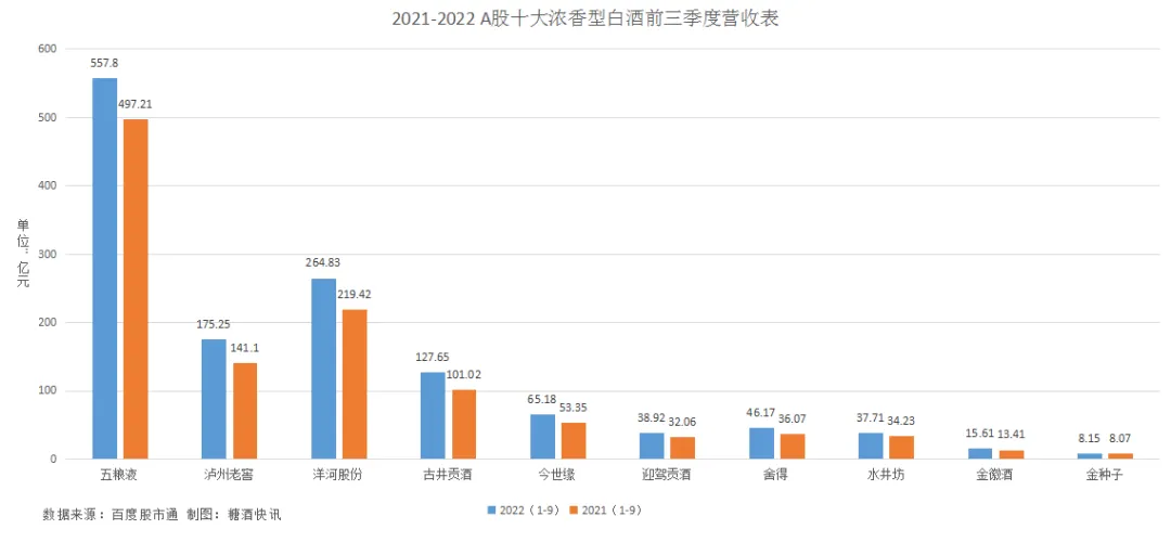 从头部浓香型白酒的成绩来看2022年也算是“稳中有进”的,2022年前三季度十大浓香型白酒上市企业(五粮液、泸州老窖、洋河、古井、今世缘、迎驾、舍得、水井坊、金徽、金种子)总营收为1337.27亿元,较上年同期1135.94亿元同比增长17.72%。