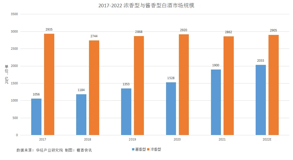 其次是“酱香温热”。从增速来看,2022年酱香型白酒市场表现有较大降温,结束了近些年高增长的状态(2017-2021年营业规模分别为1056亿元、1184亿元、1353亿元、1528亿元、1900亿元),根据华经产业研究院预测,2022年酱香型白酒营业收入为2033亿元,增速更是跌至个位数,仅为7%。