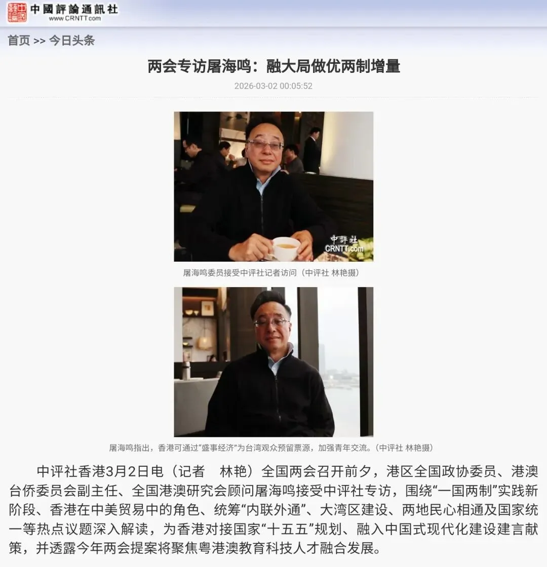 香港中评社3月2日发文专访港区全国政协委员、港澳台侨委员会副主任、全国港澳研究会顾问屠海鸣。屠海鸣认为,对接国家“十五五”规划,香港需做好“内联”与“外通”的统筹。外通方面,持续发挥“超级联络人”作用,与内地协作推动“拼船出海”,积极参与进博会等国际平台。
