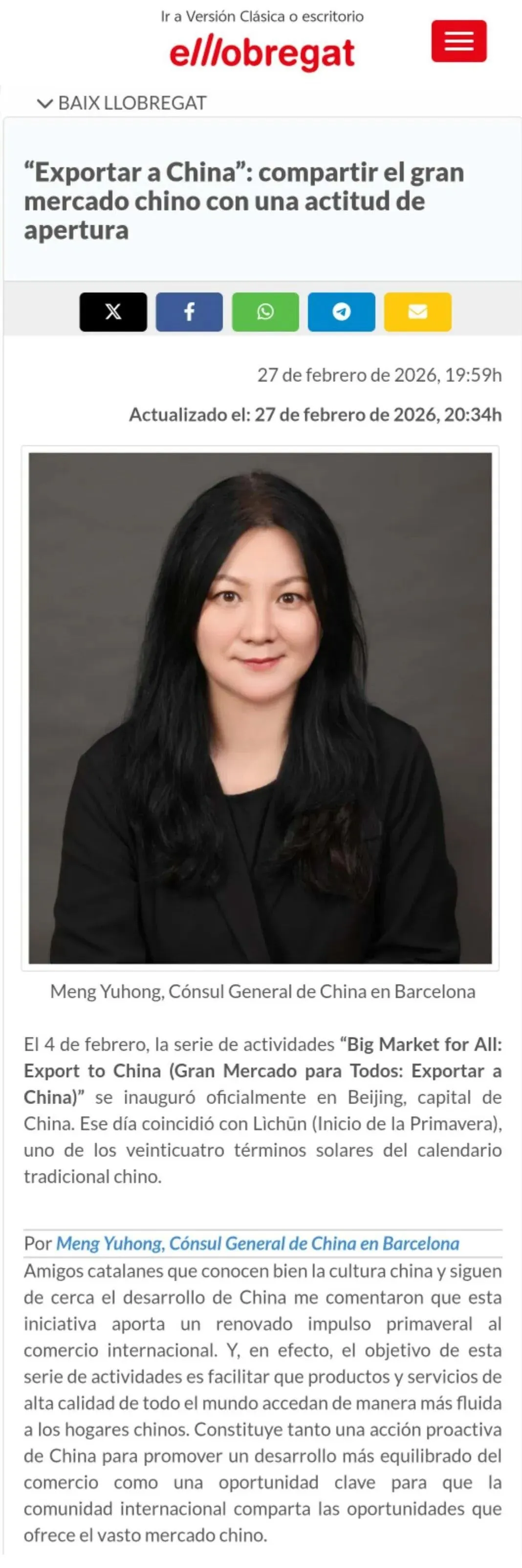 西班牙略夫雷加特报发表中国驻巴塞罗那总领事孟宇宏署名文章《“出口中国”:以开放之姿共享中国大市场》。文章称,当前全球范围贸易保护主义持续抬头,而中国坚定扩大进口,助力贸易伙伴扩大出口,连续8年举办进博会,既是对贸易保护主义的有力回击,更为世界经济发展注入新动能、创造新机遇。