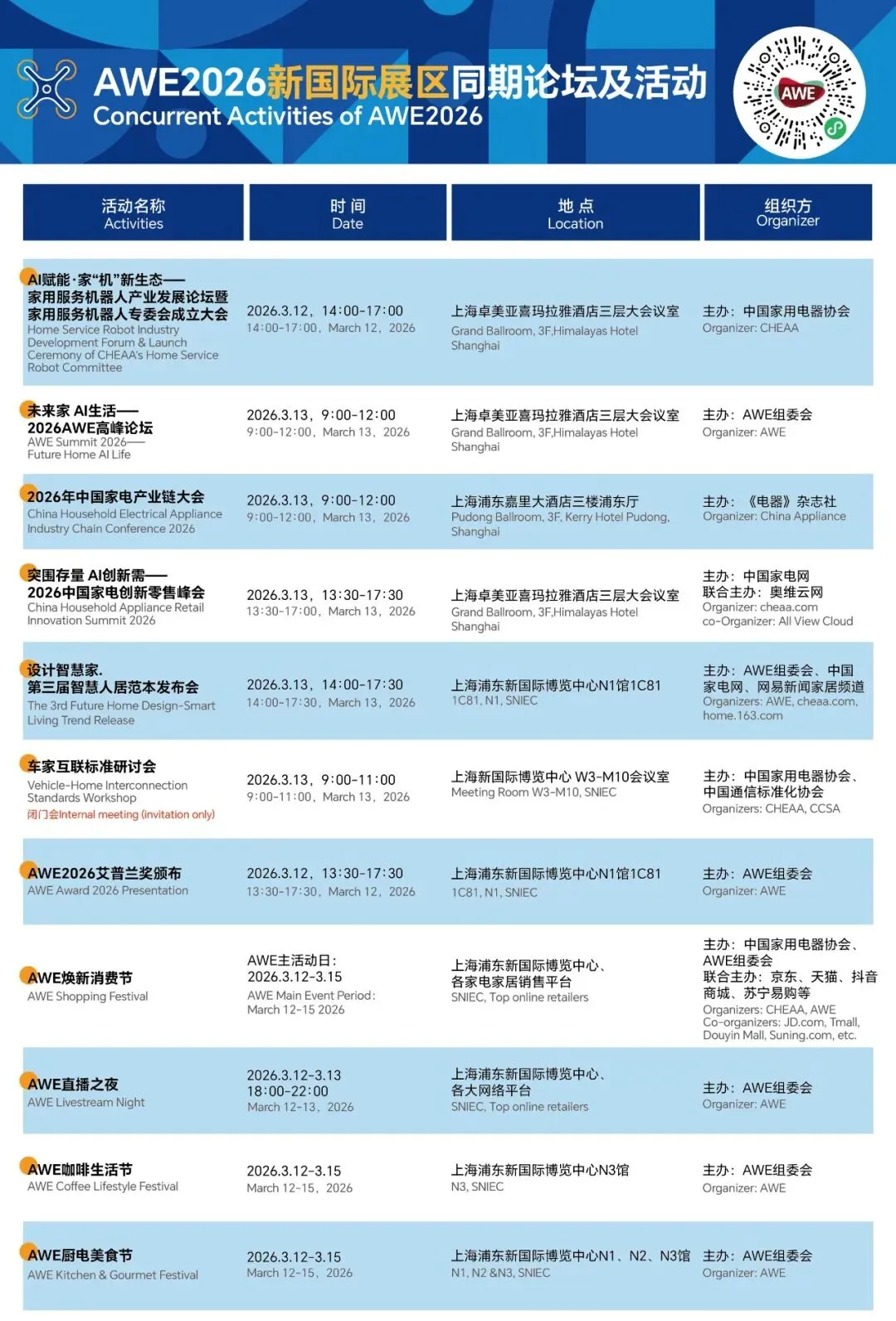 12到13,不仅仅是数字的增加,更是AWE边界的一次次突破。从新设立的创新科技展区到产业链的独立成馆,从包馆企业的阵营扩充到两大生活节的首次推出,AWE2026再次向外界表明,那个曾经以家电为核心的展会,已经演变为一个汇聚新物种、新生态、新纪元的科技生活方式展。