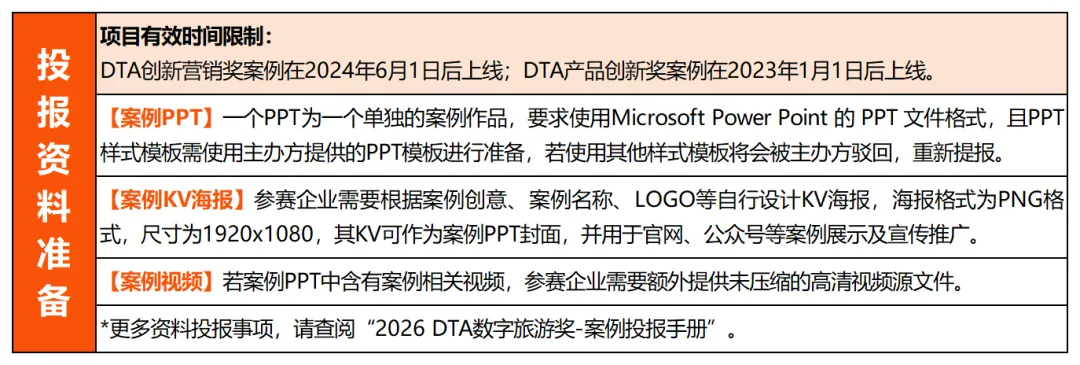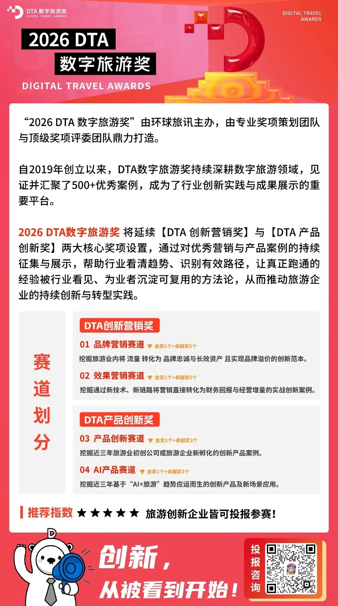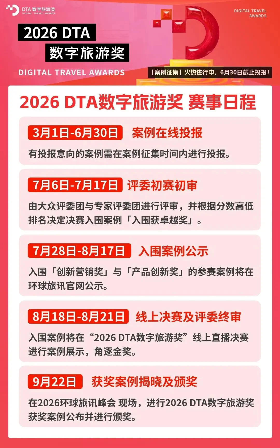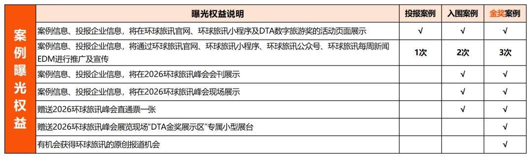 也正因为如此,DTA数字旅游奖 始终把目光投向那些敢试错、能落地、持续进化的行业创新者。从旅游局到OTA,从传统景区到主题乐园,从酒店集团到酒旅科技公司,我们始终期待,可以与您一起探索旅游业的更多边界和无限可能!“2026 DTA数字旅游奖” 案例征集 已经启动,欢迎您的投报,您的创新案例值得被更多旅游业者看见!自2019年首届举办,DTA数字旅游奖已连续成功举办7届,成功吸引了420+家旅游企业投报,共征集优秀创新案例作品580+,平均每届观赛人数突破6800+,赛事曝光度达38W+。我们不追风口,不卖奖项,只关注那些敢试错、能落地、持续进化的创新项目实战者,为旅游行业沉淀可复用的方法论。2025年,DTA数字旅游奖 涌现出了一批走在行业前沿的优秀创新者。2026年,也将会出现更多“让旅行更有温度、让经营更有效率”的创新案例出现,欢迎您的投报!“2026 DTA数字旅游奖” 紧扣旅游行业 “数智化+体验化” 发展趋势,延续两大核心奖项、四大垂直赛道设置,精准覆盖旅游企业营销创新与产品创新全维度。无论是品牌长效营销布局、效果营销实战成果,还是前沿产品研发、AI+旅游新场景应用,都能找到专属展示舞台,适配品牌方(OTA、酒店、航空公司、旅游局、邮轮、旅行社等)、平台方(腾讯、抖音、小红书)、营销服务商、旅游科技等全业态创新案例投报。公平公正的评审体系,兼具声望和专业的⼤赛评委,赋予了“DTA数字旅游奖”在旅游业内的高含金量价值。2026年,环球旅讯将从专业性、多元性、严谨性三个方面来进一步完善奖项评审流程,并特别邀请到60+位来自酒店、航司、OTA、旅游科技企业的CMO/CTO,及在旅游业某一领域有实际操盘经验的营销专家/产品技术大牛等极具行业影响力的旅游业大咖组成大赛的专业评审团,从多元视角、实操经验及敏锐洞察力来对投报案例进行评选,决出金奖。(*以下为“2025DTA数字旅游奖”评委阵容。)“2026 DTA数字旅游奖”还将依托以环球旅讯为核心的全渠道传播能力,为参赛企业及案例作品提供更深度、更全面、更精准的品牌曝光。对于投报案例,创新案例信息及投报企业将有机会在环球旅讯官网、环球旅讯小程序及DTA数字旅游奖的活动页面展示,并可在环球旅讯公众号、EDM、行业社群等多渠道进行推广宣传。您的创新实践不仅能被行业高层看见,更有机会通过创新案例分享和深度解读,成为启迪行业的标杆。入围及获奖案例企业代表,将受邀出席全球旅游业内极具影响力的“2026 环球旅讯峰会”,在【主论坛】环球旅讯峰会-特别颁奖环节 接受颁奖。在峰会现场,您将有机会与1800+位来自全球旅游业的中高层管理者、决策者面对面交流学习。与此同时,入围案例也将会在“2026 环球旅讯峰会”现场及活动会刊中获得展示曝光;金奖案例还可额外解锁峰会专属展台、环球旅讯原创报道等稀缺权益,实现品牌精准触达与行业影响力快速提升。这不仅是一次荣誉加冕,更是一次链接商机、拓展人脉的绝佳机会。
