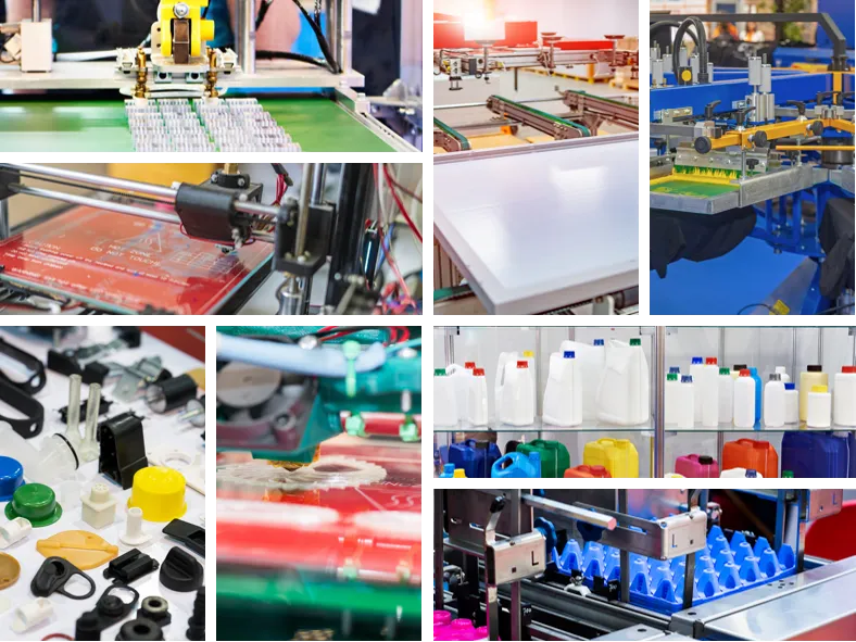 各种注塑机、挤出机及生产线、吹塑机、吹瓶机、热成型机、吸塑机、裁断机、回收再生机械、3D 打印技术等橡塑装备。