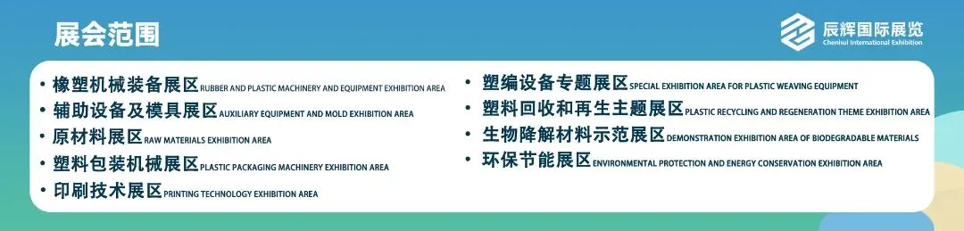 9.塑料再生及可循环展区:再生塑料、塑料破碎料、副原料;含再生材料的改性材料;高性能再生材料助剂;家电、汽车拆解、塑料回收打包站;塑料再生园区、回收和再生装备;化学回收、热解技术与设备;废气处理、废水处理、过滤网处理设备;塑料性能检测设备;回收再生材料检测、认证机构等。