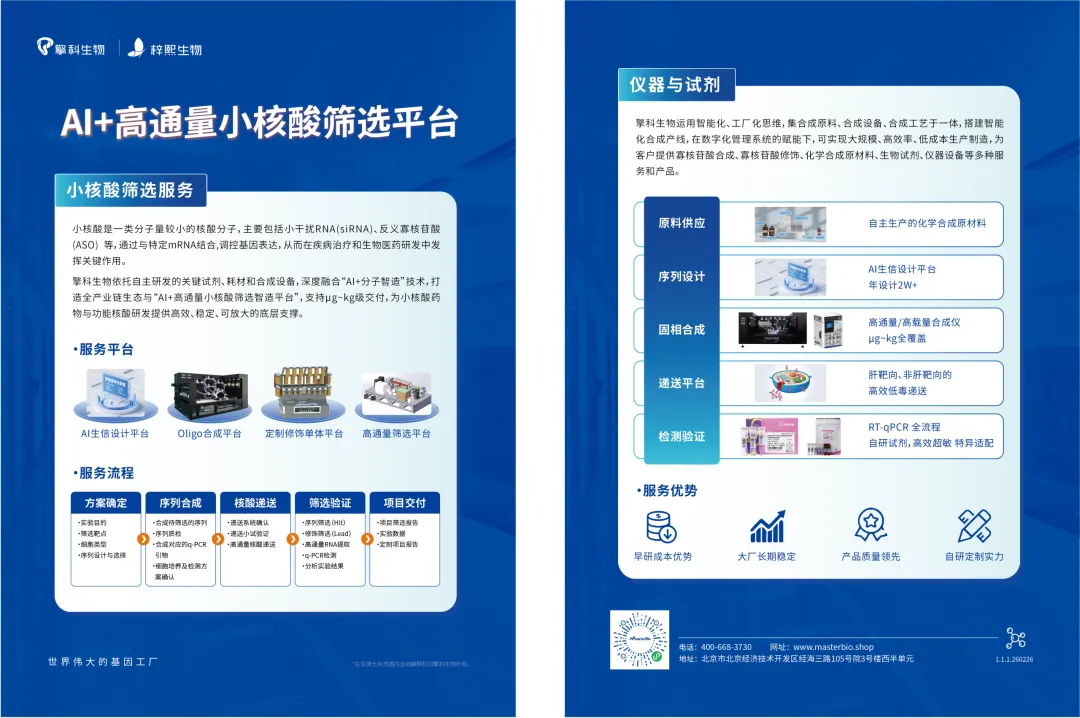 擎科生物依托自主研发的关键试剂、耗材和合成设备,深度融合“AI+分子智造”技术,打造全产业链生态与“AI+高通量小核酸筛选智造平台”,支持从μg到kg级的灵活交付,为小核酸药物与功能核酸的研发提供高效、稳定、可放大的底层支撑。