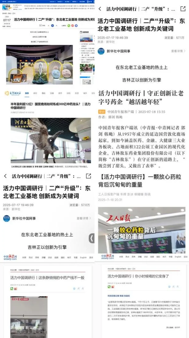 采访团以多元视角记录创新实践:新华网和新华社客户端刊发《活力中国调研行丨二产“升级”:东北老工业基地 创新成为关键词》;中国青年报刊发《活力中国调研行丨守正创新让老字号药企“越活越年轻”》;大河财立方刊发《半年盈利超12亿!国营鹿场如何炼成300亿中药龙头?|活力中国调研行》;工人日报刊发《活力中国调研行丨一颗放心药粒背后沉甸甸的重量》;科技日报刊发《活力中国调研行丨这条静悄悄的中药产线不一般》和《活力中国调研行丨你小时候喝的它变身了》。从一粒放心药到一座产业城,敦化正在“破茧”中积蓄“成势”之力,书写着东北县域经济高质量发展的鲜活样本。