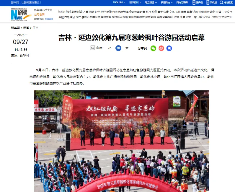 秋季,第九届寒葱岭枫叶谷游园活动如约而至。人民网、新华网和央广网、中国新闻网和中国网刊发相关稿件《吉林・延边敦化第九届寒葱岭枫叶谷游园活动启幕》、《全网直播预告!两场专属直播带你“云游”寒葱岭“双红”盛景》和《地道铁锅炖、红色徒步行、秋日枫景游 第九届延边敦化寒葱岭枫叶谷游园活动嗨翻天》,将自然生态观赏与红色文化教育相结合的特色活动推向全国。活动推出徒步集章、红色研学、特色美食品鉴等多元内容,吸引数百名游客沿红叶步道开展徒步活动。
