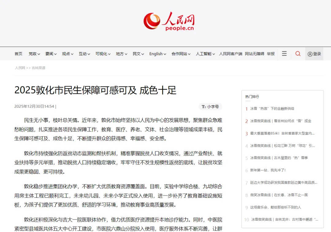 在更细致的民生叙事中,敦化用数据丈量民情,更以温度回应期待。在社区治理方面,人民网发布《敦化市胜利街道长城社区“代理儿女”用心守护老人幸福晚年》、《敦化市民主街道以“星火之光”点亮“社区治理”路上“不灭灯塔”》等数百篇报道,展现了党建引领下基层治理的创新探索。