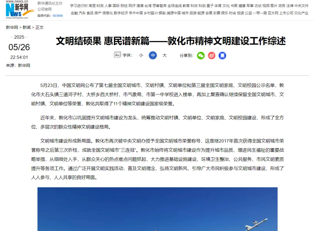 2025年,敦化市民生保障可感可及,成色十足。中央新闻媒体热切关注敦化持续推进城市更新与农村人居环境改善。人民网岁末盘点《2025敦化市民生保障可感可及 成色十足》;新华网以《文明结硕果 惠民谱新篇——敦化市精神文明建设工作综述》为题,点赞敦化精神文明建设成就——11个国家级荣誉花落敦化,全国文明城市“三连冠”实至名归;央广网以《敦化:家门口就业惠民生 制衣厂撑起妇女增收半边天》和《敦化:小纸箱撑起大产业》记录下产业惠民、就业富民的生动实践。