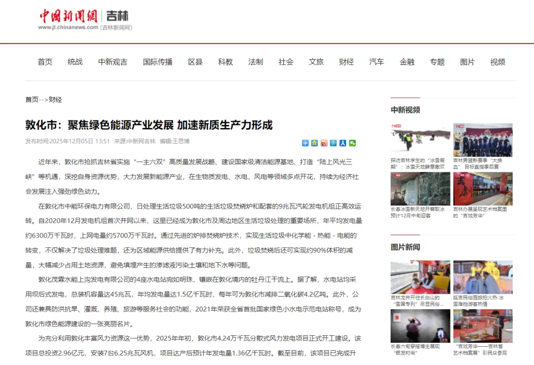 敦化市坚持生态优先,绿色发展底色更加鲜明。人民网、中国新闻网聚焦敦化绿色能源产业发展,刊发《敦化:聚焦绿色能源产业发展 加速新质生产力形成》,一幅“风光水”多能互补的绿色画卷在敦化大地徐徐展开。央广网持续关注水土治理,发布《敦化市打好水利项目建设开年“第一仗”》、《敦化:抢先抓早开复工水利项目建设》和《敦化完成38座中小型水库的维修养护项目建设》等稿件。人民网亦对水利建设高度关注,刊发《敦化市额穆灌区水毁修复工程计划2025年春灌前完工》、《敦化市2024年侵蚀沟专项治理工程预计今年6月交工验收》和《中小河流富尔河敦化大蒲柴河镇治理工程提前完工》等稿件,记录下水利基础设施的加固与提升。