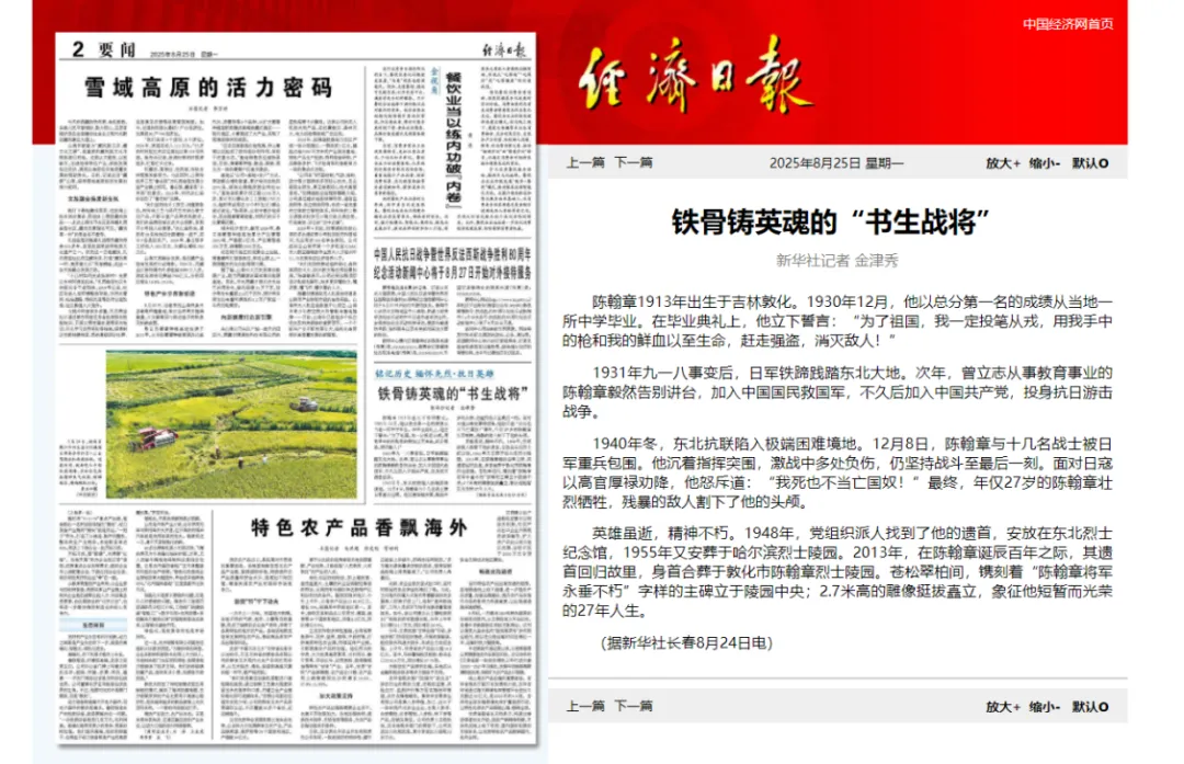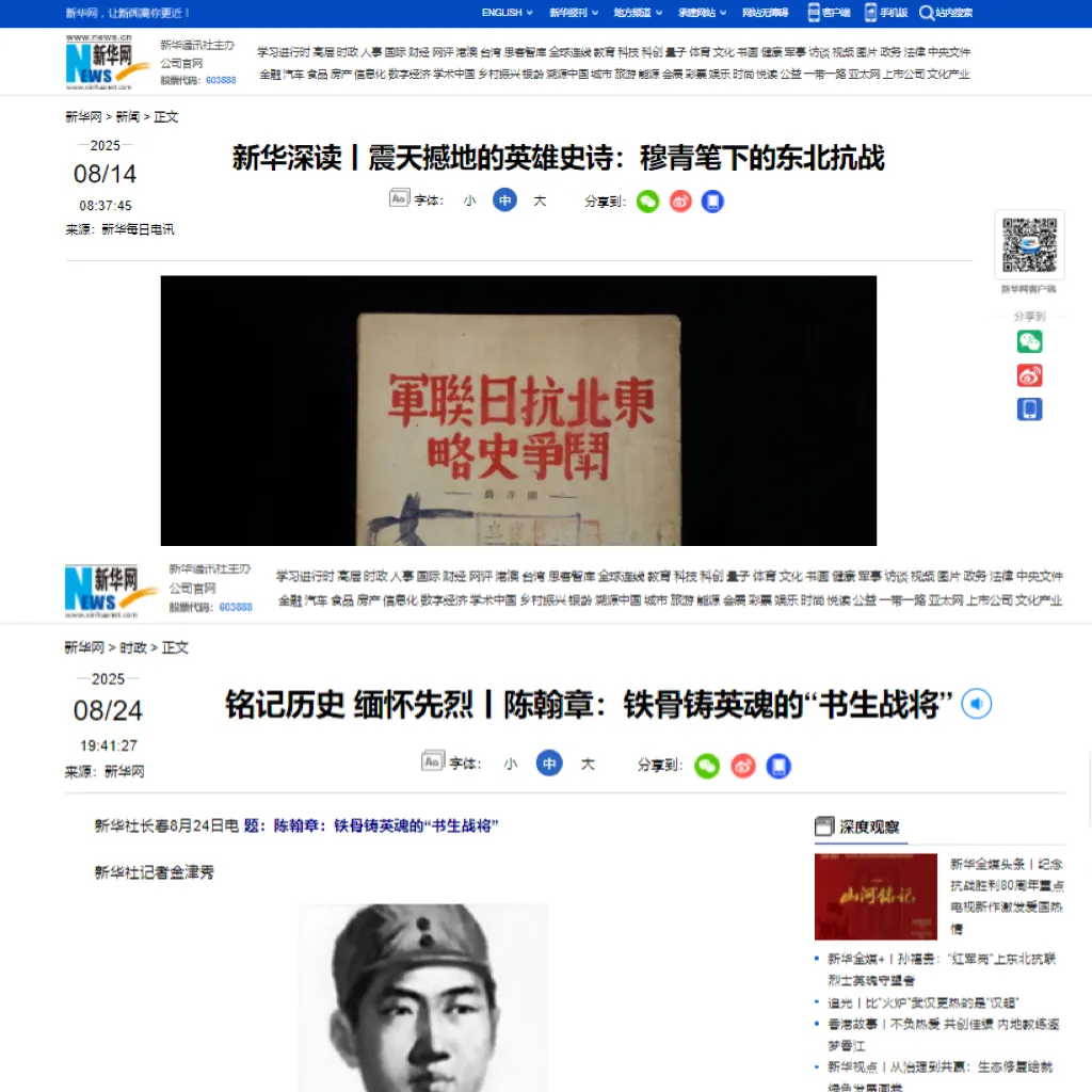 在敦化这片浸染着烈士鲜血的红色沃土上,与戴氏家族的满门忠烈交相辉映的,是另一位顶天立地的英雄——东北抗联名将陈翰章。2025年,陈翰章将军的事迹被赋予了更厚重的时代回响。《经济日报》以《铁骨铸英魂的“书生战将”》为题,再现了他从三尺讲台走向抗日疆场的人生抉择;新华网连续刊发《震天撼地的英雄史诗:穆青笔下的东北抗战》、《铭记历史 缅怀先烈丨陈翰章:铁骨铸英魂的“书生战将”》等文章,以细腻笔触追忆烽火岁月,让这位文武兼备的青年将领从历史深处走进当代人的精神世界。