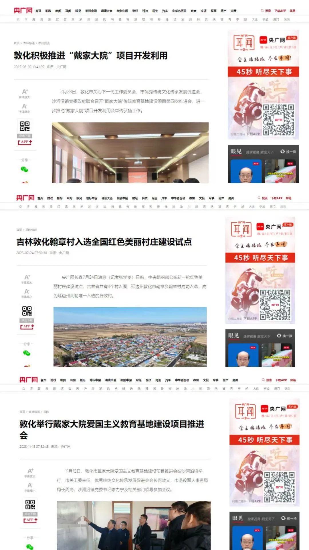 与此同时,以英雄命名的翰章村,入选全国红色美丽村庄建设试点,正如火如荼地进行着红色基因的活态传承。央广网持续刊发《敦化积极推进“戴家大院”项目开发利用》、《吉林敦化翰章村入选全国红色美丽村庄建设试点》、《敦化举行戴家大院爱国主义教育基地建设项目推进会》等稿件,展现出红色基因在新时代焕发新光芒。