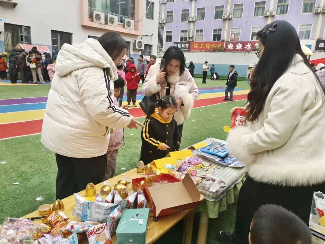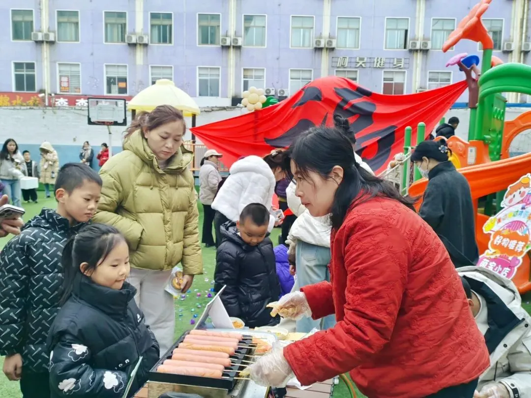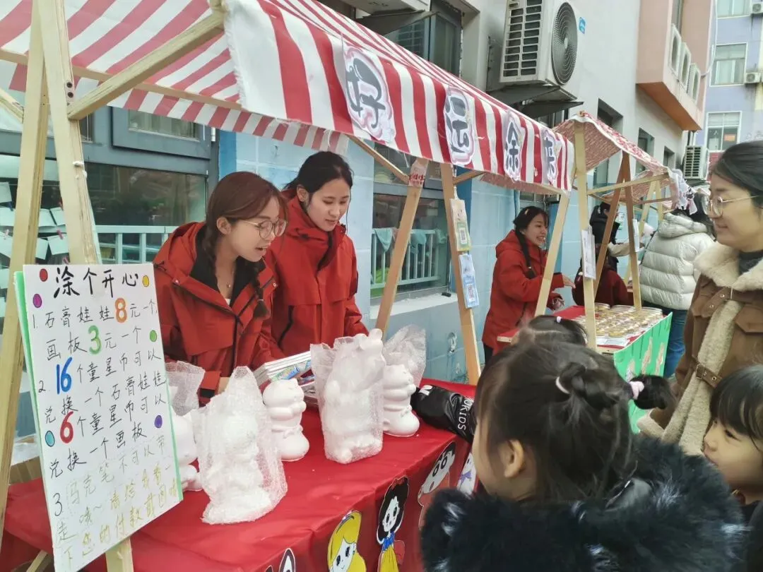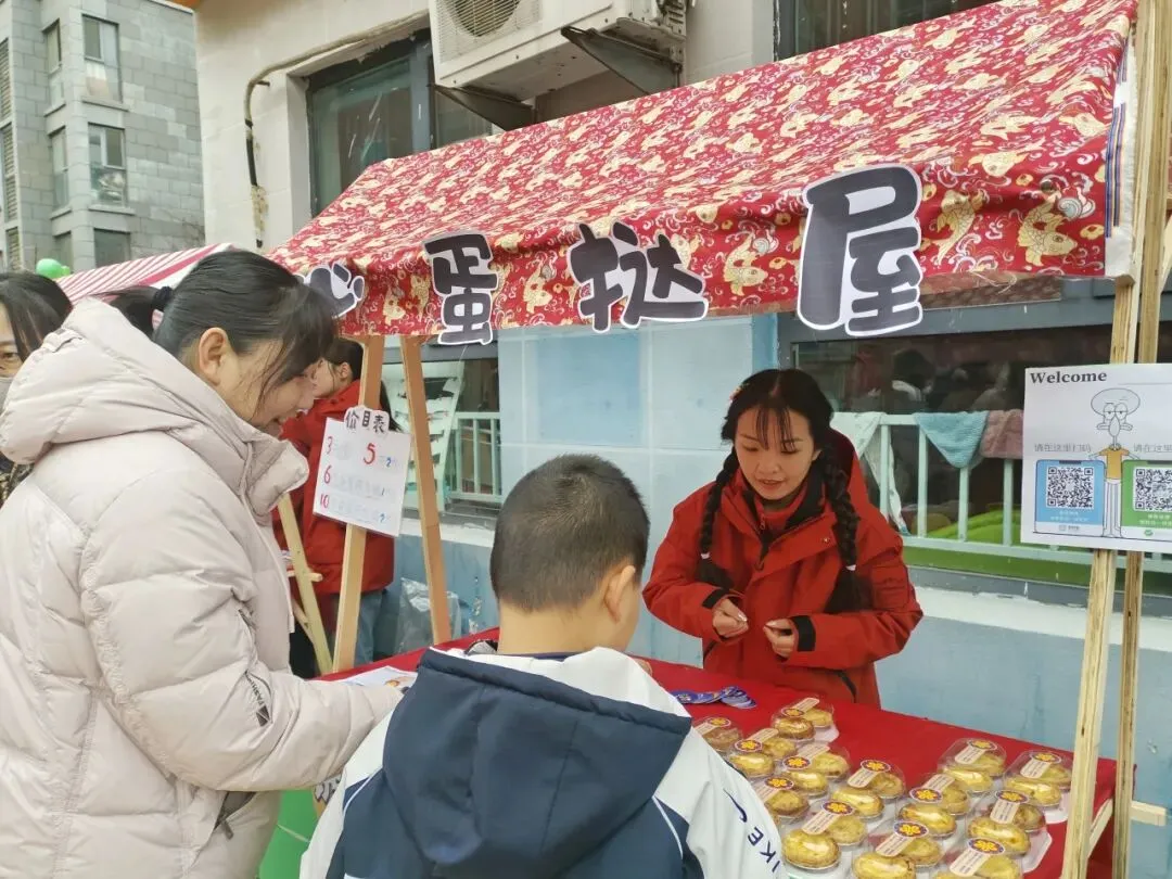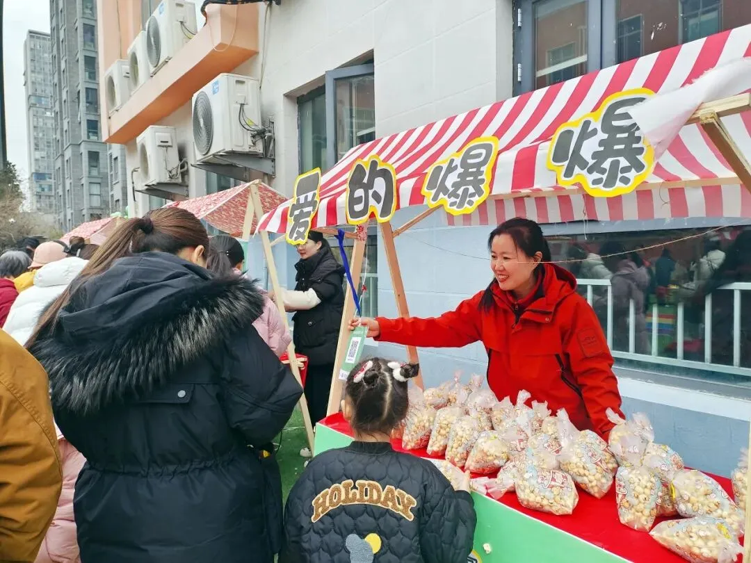 七大特色摊位沿主干道铺展,氤氲着舌尖上的幸福:爆米花,雪白云朵在孩子们惊呼声中升腾;暖粥小铺,现熬八宝粥,温润滋养春日清晨;爱心蛋挞屋,酥香蛋挞由厨房工作人员亲手烘焙;畅享棉花糖与 畅享美好(香肠摊,甜蜜与烟火气并存;好运涂来(石膏娃娃涂色区),静心创作,把独一无二的“园庆记忆”带回家。另有7处家长自主摊位,从手工发饰、绘本漂流到自然拓印,展现了家园共育的无限创意与温度。