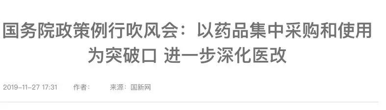 刚刚,国务院吹风会传出消息,有序扩大集采品种范围。据业内媒体消息,今日(11月27日)下午,上海联采办就药品集中采购召开企业座谈会,为新一轮带量采购扩品种提前摸底——默克、拜耳、石药、赛诺菲、科伦、恒瑞、正大天晴、齐鲁等8家企业参与座谈会,部分行业协会到场。同日稍晚时候,在国务院政策例行吹风会上,国务院医改领导小组秘书处副主任、国家卫生健康委员会副主任王贺胜表示,相关部门起草了《关于以药品集中采购和使用为突破口进一步深化医药卫生体制改革的若干政策措施》,已于11月20日经国务院第71次常务会议审议通过,近期将以国务院医改领导小组名义印发。