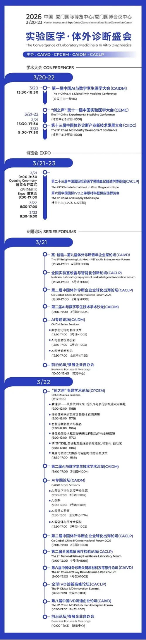 由智奥瑞和(上海)展览有限公司主办的第二十三届中国国际检验医学暨输血仪器试剂博览会(CACLP)、第六届中国国际IVD上游原材料暨供应链博览会(CISCE)将于 2026 年 3 月 21 日至 23 日在厦门国际博览中心隆重举行。