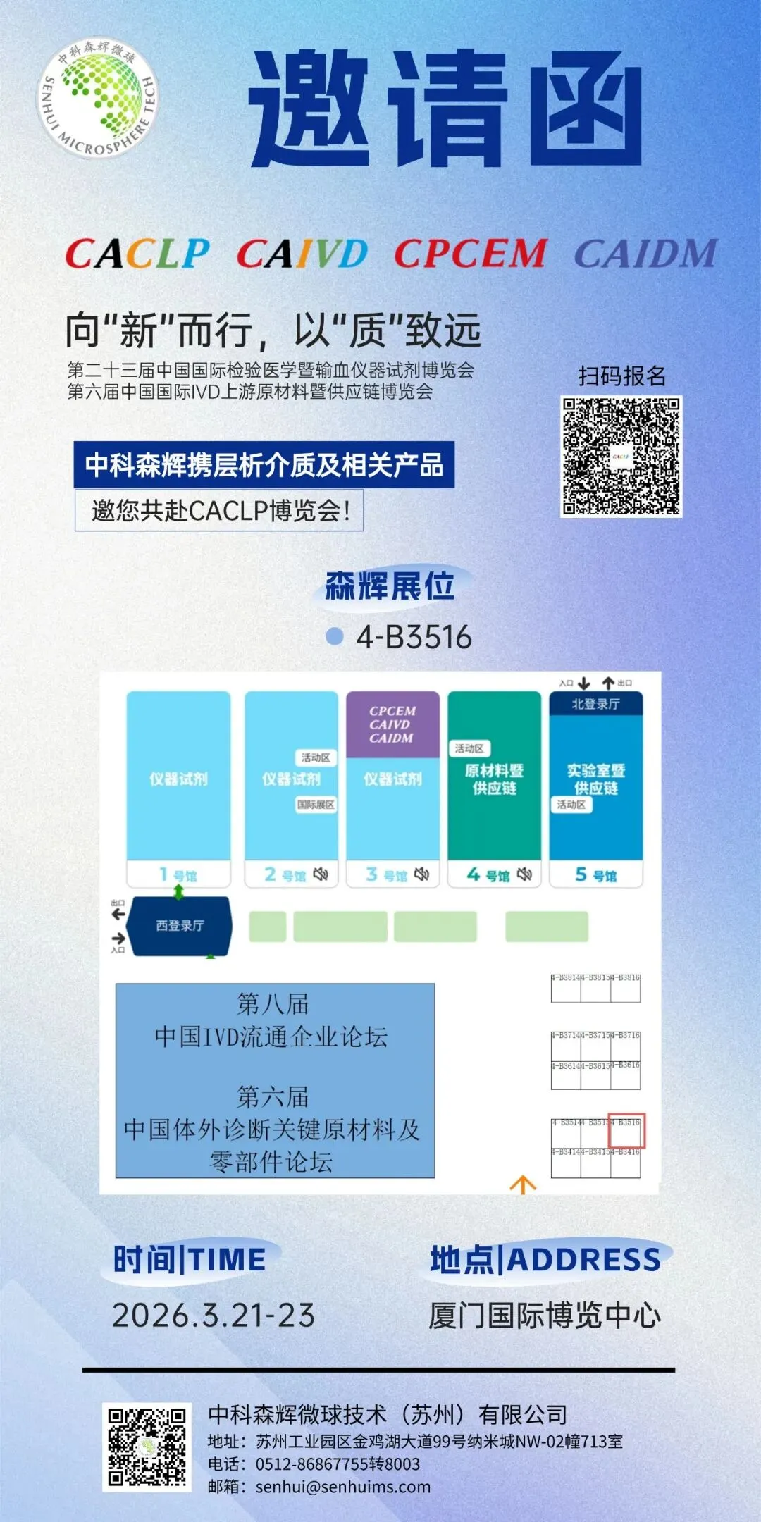 中科森辉微球技术(苏州)有限公司(简称:中科森辉)受邀出席本次博览会并在原材料暨供应链展区4馆设立展位4-B3516,届时将携中科森辉IVD原料领域层析介质明星产品、预装柱以及分离纯化整体解决方案亮相博览会,诚邀各位老师、业界同仁莅临参观交流,共同探讨行业发展新机遇。