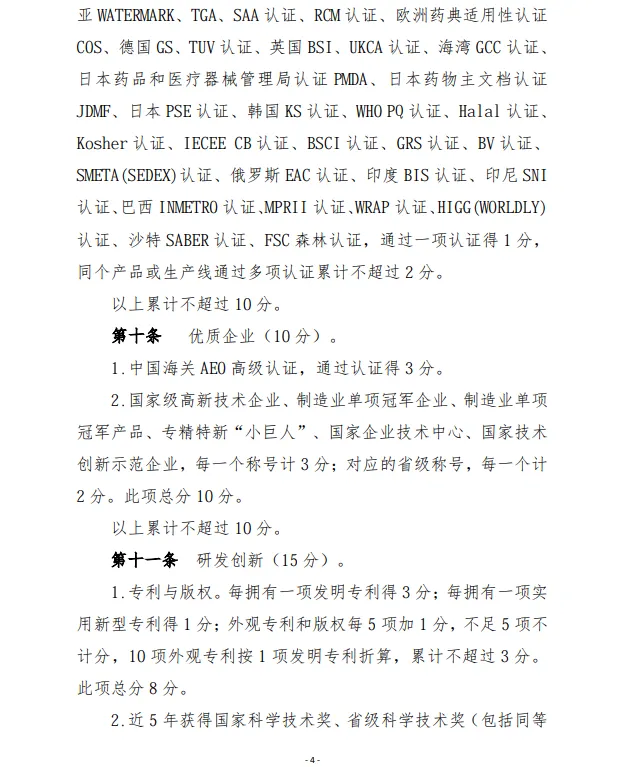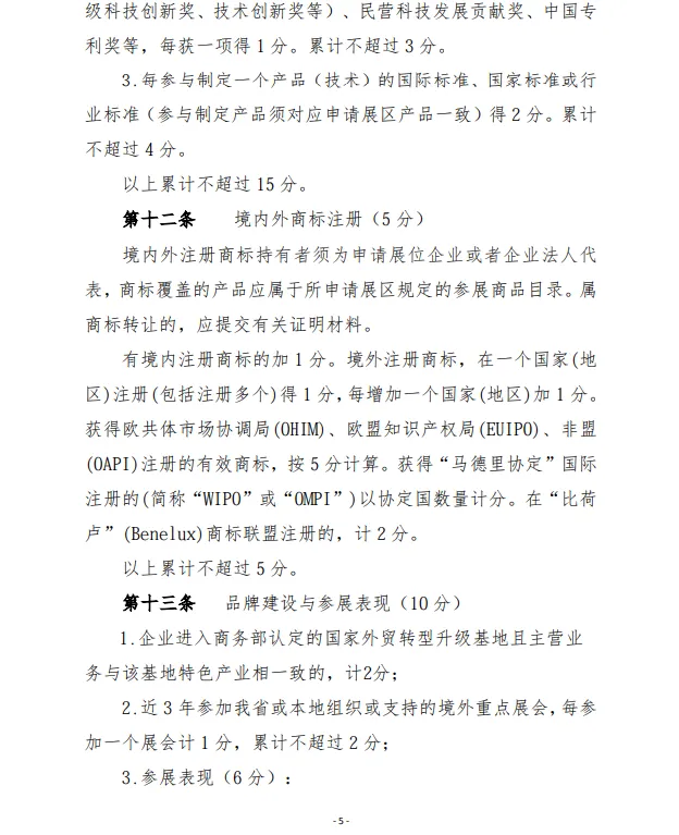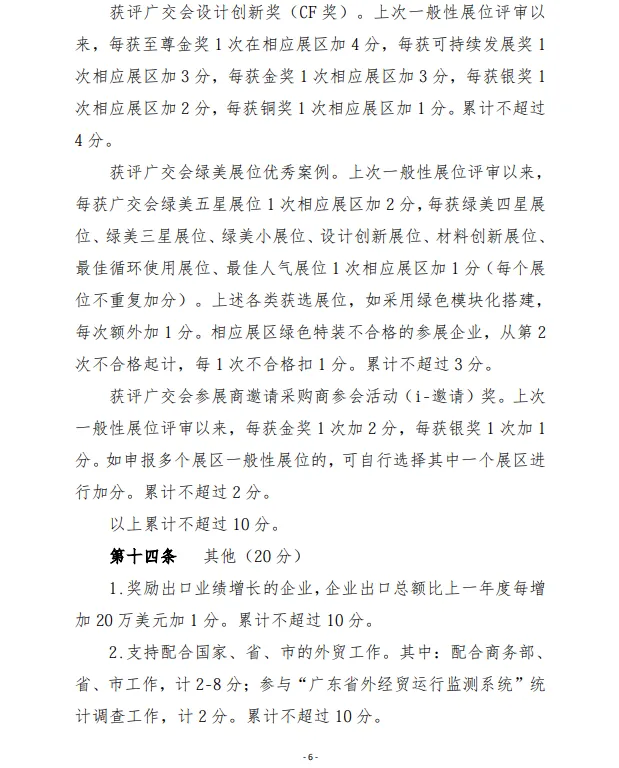 一、《实施细则》第三章第十四条第2款中“支持配合国家、省、市的外贸工作。其中:配合商务部、省、市工作,计2-8分;”明确计分标准为:近3年参加东莞市重点推荐的境外展,每参加1个展会计2分,累计不超过4分;参加全球智能机械与电子产品博览会、广东优品展等,每参加一个展会计2分,累计不超过4分。
