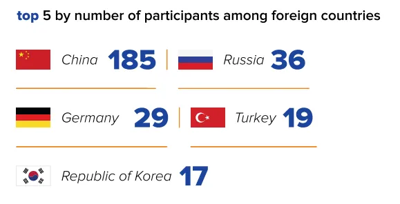 展商来源地:30+,包括中国、俄罗斯、德国、土耳其、韩国、澳大利亚、阿塞拜疆、保加利亚、柬埔寨、埃及、法国、印度尼西亚、泰国、哈萨克斯坦等国家及地区。